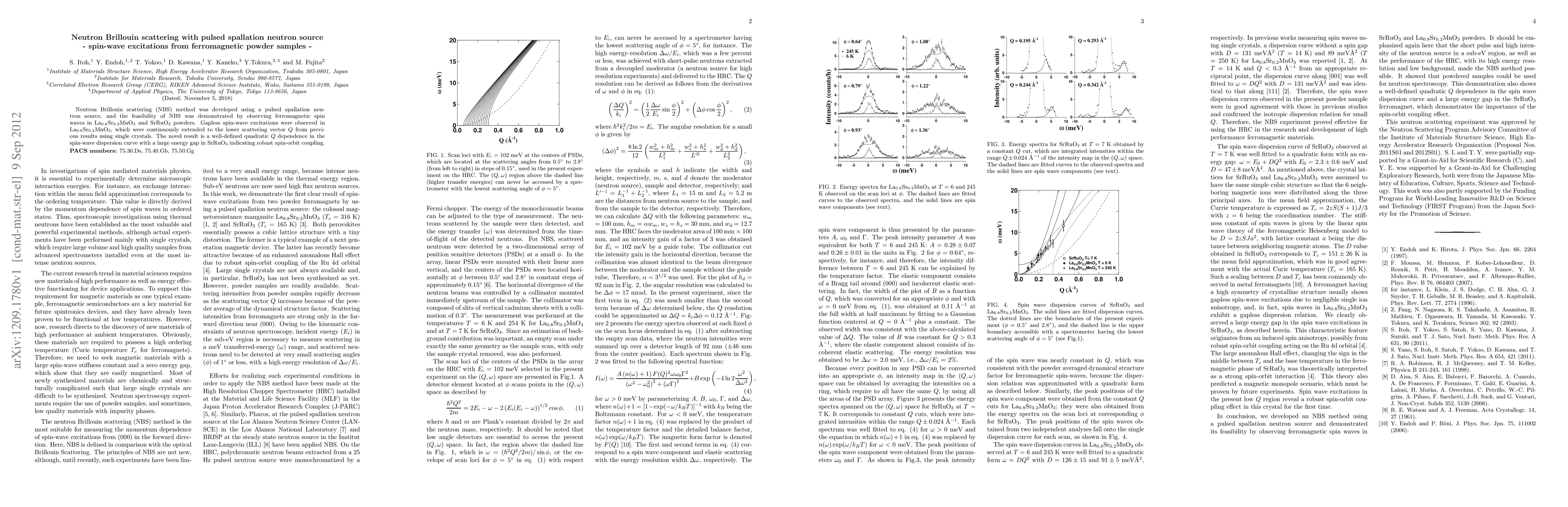 Neutron Brillouin scattering (NBS) using a pulsed spallation neutron source successfully observed spin-wave excitations in ferromagnetic powder samples, notably revealing a well-defined quadratic $Q$ dependence in La$_{0.8}$Sr$_{0.2}$MnO$_3$ and a large energy gap in SrRuO$_3$ indicating strong spin-orbit coupling.