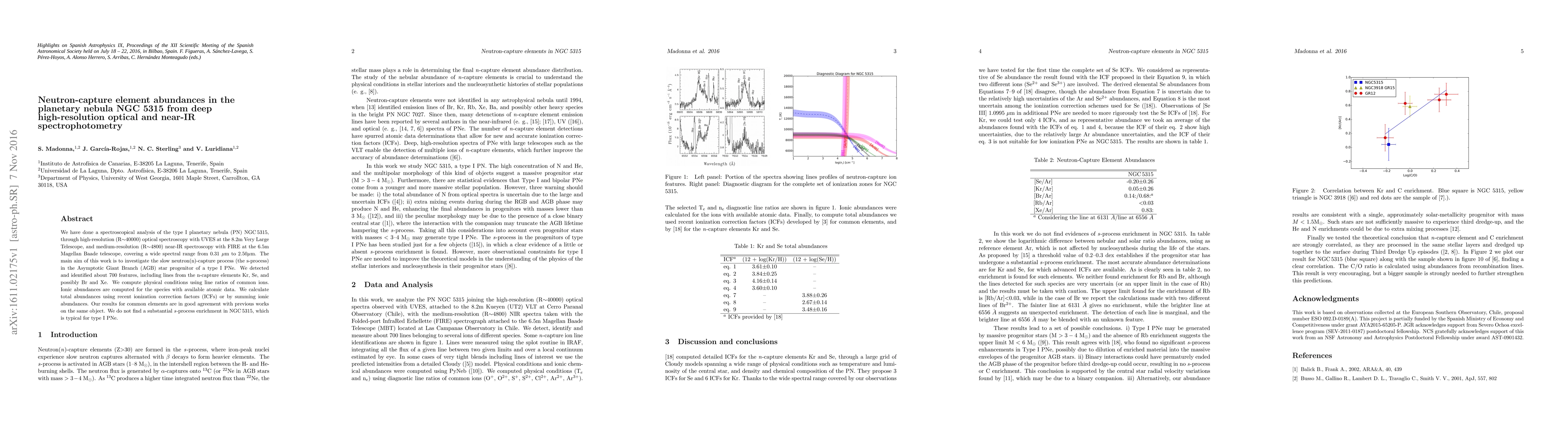 We have done a spectroscopical analysis of the type I planetary nebula (PN) NGC 5315, through high-resolution (R$\sim$40000) optical spectroscopy with UVES at the 8.2m Very Large Telescope, and medium-resolution (R$\sim$4800) near-IR spectroscopy with FIRE at the 6.5m Magellan Baade telescope, covering a wide spectral range from 0.31 $\mu$m to 2.50 $\mu$m. The main aim of this work is to investigate the slow neutron(n)-capture process (the s-process) in the Asymptotic Giant Branch (AGB) star progenitor of a type I PNe. We detected and identified about 700 features, including lines from the n-capture elements Kr, Se, and possibly Br and Xe. We compute physical conditions using line ratios of common ions. Ionic abundances are computed for the species with available atomic data. We calculate total abundances using recent ionization correction factors (ICFs) or by summing ionic abundances. Our results for common elements are in good agreement with previous works on the same object. We do not find a substantial s-process enrichment in NGC 5315, which is typical for type I PNe.