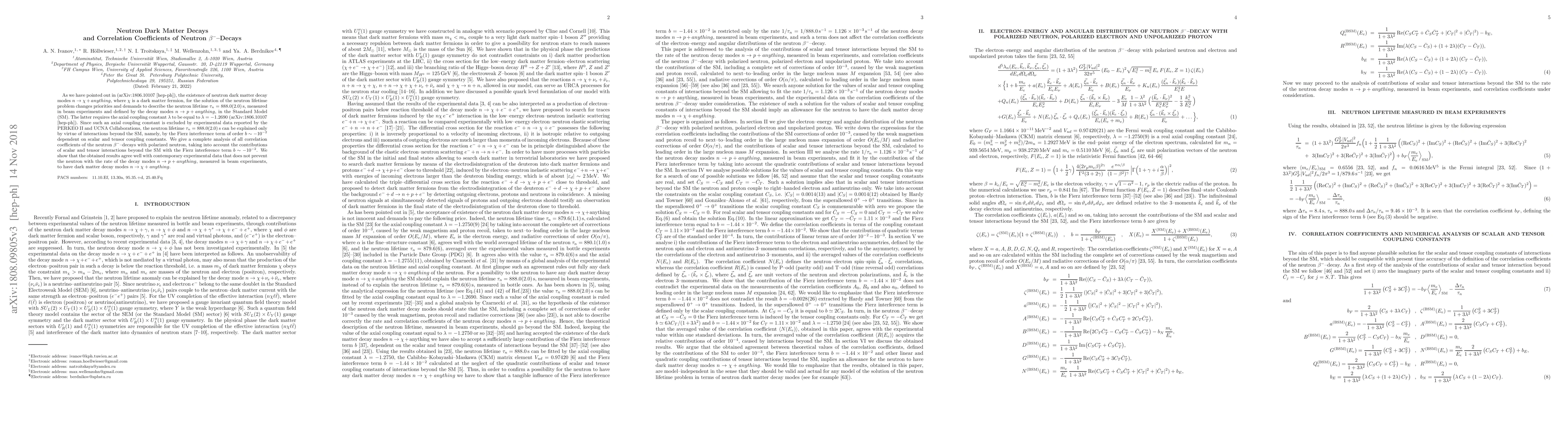 As we have pointed out in (arXiv:1806.10107 [hep-ph]), the existence of neutron dark matter decay modes "n -> chi + anything", where "chi" is a dark matter fermion, for the solution of the neutron lifetime problem changes priorities and demands to describe the neutron lifetime "tau_n = 888.0(2.0)s", measured in beam experiments and defined by the decay modes "n -> p + anything", in the Standard Model (SM). The latter requires the axial coupling constant "lambda" to be equal to "lambda = - 1.2690" (arXiv:1806.10107 [hep-ph]). Since such an axial coupling constant is excluded by experimental data reported by the PERKEO II and UCNA Collaborations, the neutron lifetime "tau_n = 888.0(2.0)s" can be explained only by virtue of interactions beyond the SM, namely, by the Fierz interference term of order "b ~ - 10^{-2}" dependent on scalar and tensor coupling constants. We give a complete analysis of all correlation coefficients of the neutron beta decays with polarized neutron, taking into account the contributions of scalar and tensor interactions beyond the SM with the Fierz interference term "b ~ - 10^{-2}". We show that the obtained results agree well with the contemporary experimental data that does not prevent the neutron with the rate of the decay modes "n -> p + anything", measured in beam experiments, to have dark matter decay modes "n -> chi + anything".