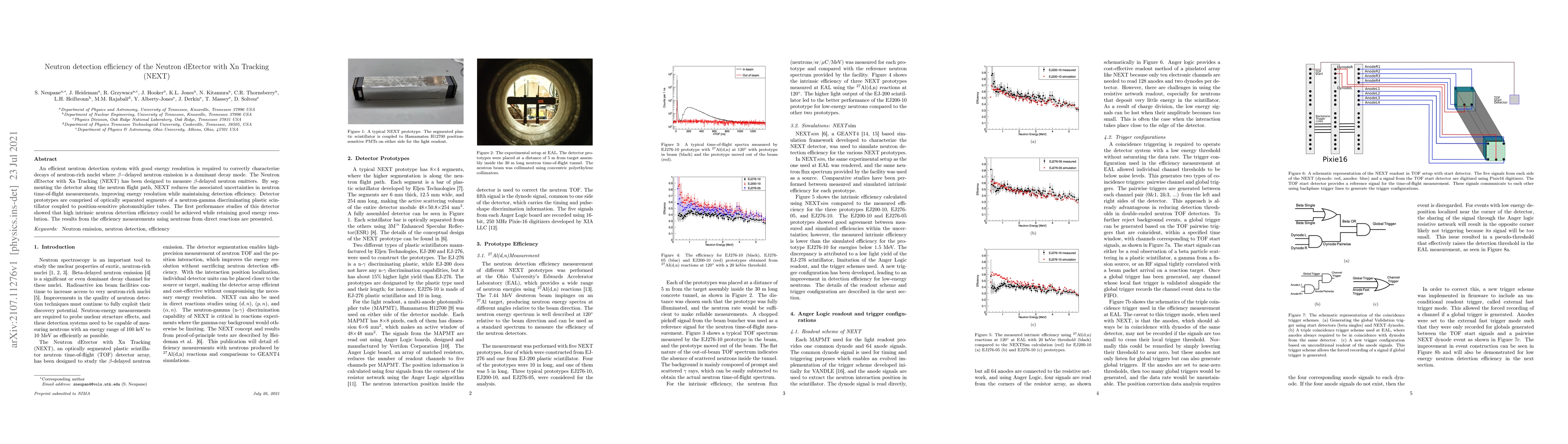 An efficient neutron detection system with good energy resolution is required to correctly characterize decays of neutron-rich nuclei where $\beta-$delayed neutron emission is a dominant decay mode. The Neutron dEtector with Xn Tracking (NEXT) has been designed to measure $\beta$-delayed neutron emitters. By segmenting the detector along the neutron flight path, NEXT reduces the associated uncertainties in neutron time-of-flight measurements, improving energy resolution while maintaining detection efficiency. Detector prototypes are comprised of optically separated segments of a neutron-gamma discriminating plastic scintillator coupled to position-sensitive photomultiplier tubes. The first performance studies of this detector showed that high intrinsic neutron detection efficiency could be achieved while retaining good energy resolution. The results from the efficiency measurements using neutrons from direct reactions are presented.