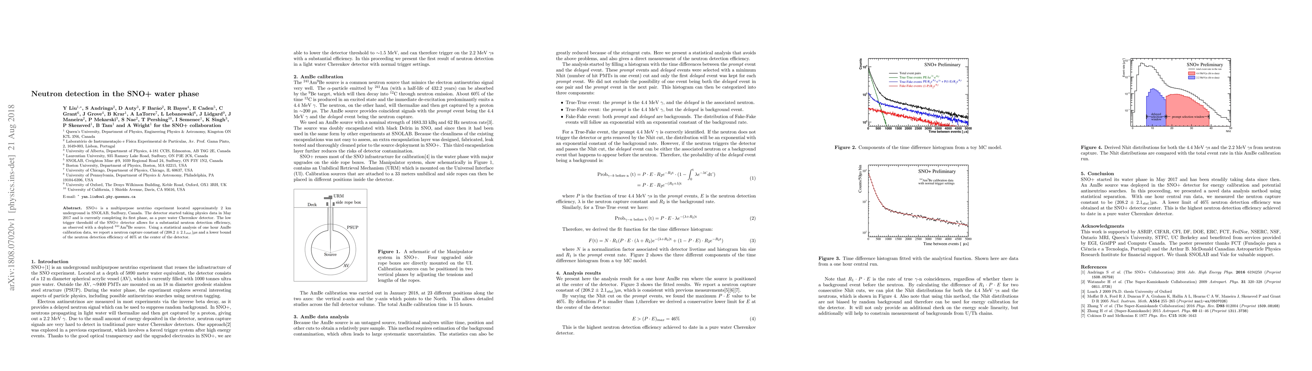 SNO+ is a multipurpose neutrino experiment located approximately 2 km underground in SNOLAB, Sudbury, Canada. The detector started taking physics data in May 2017 and is currently completing its first phase, as a pure water Cherenkov detector. The low trigger threshold of the SNO+ detector allows for a substantial neutron detection efficiency, as observed with a deployed ^{241}Am^{9}Be source. Using a statistical analysis of one hour AmBe calibration data, we report a neutron capture constant of 208.2 + 2.1(stat.) us and a lower bound of the neutron detection efficiency of 46% at the center of the detector.