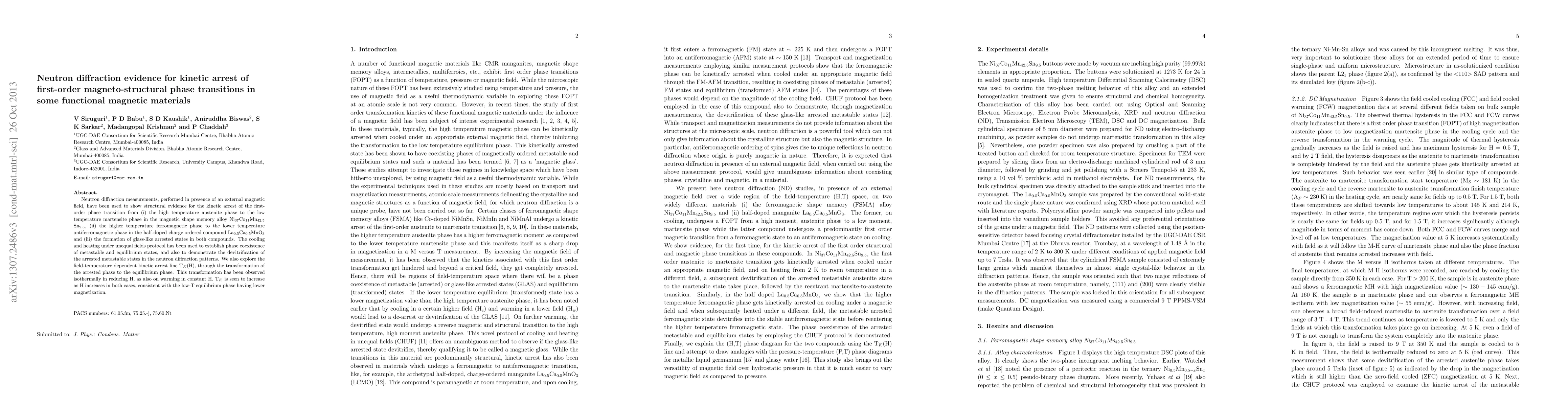 Neutron diffraction reveals kinetic arrest in first-order magneto-structural phase transitions in magnetic materials, including Ni37Co11Mn42.5Sn9.5 and La0.5Ca0.5MnO3, showing arrested glass-like states and phase coexistence via the CHUF protocol. The kinetic arrest line TK(H) increases with higher magnetic fields.