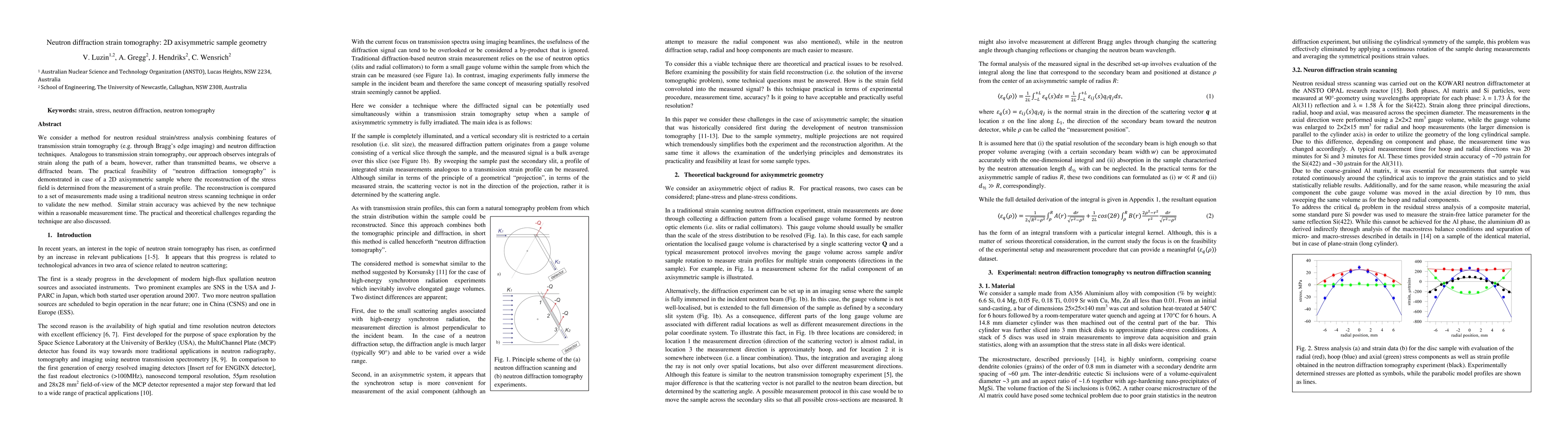 Neutron diffraction strain tomography is a novel method combining transmission strain tomography and neutron diffraction techniques to analyze residual strain/stress in 2D axisymmetric samples. The method demonstrates comparable strain accuracy to traditional neutron stress scanning, validating its feasibility and efficiency.