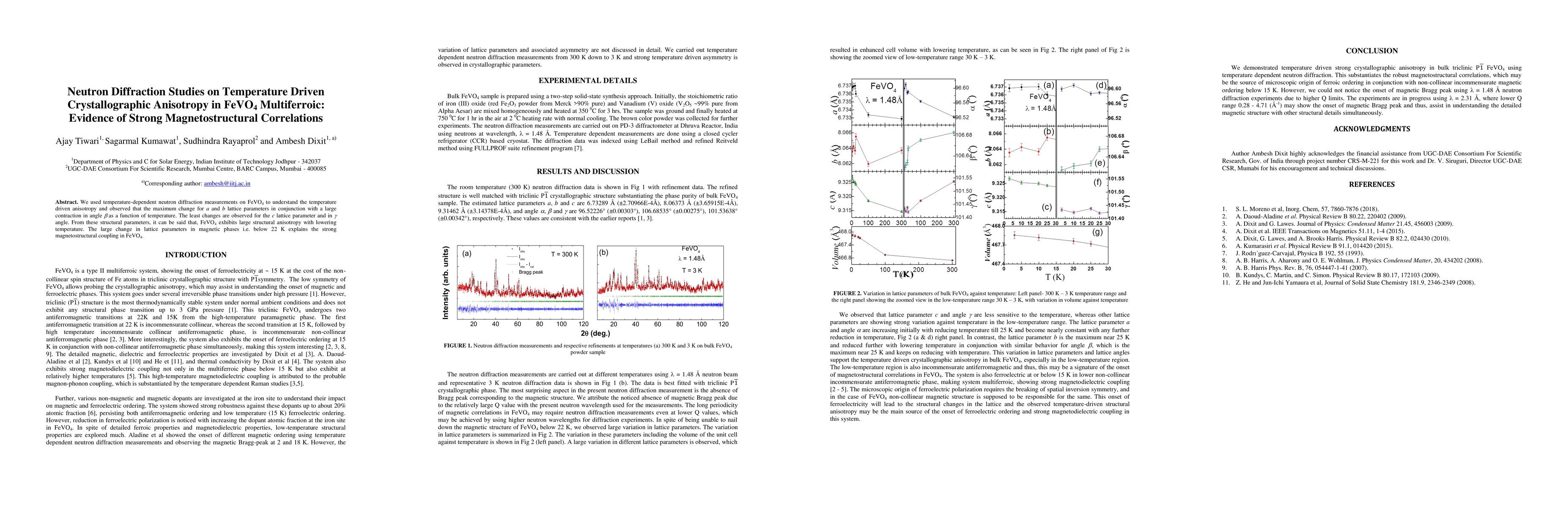 This study uses temperature-dependent neutron diffraction to reveal significant crystallographic anisotropy in FeVO4 multiferroic material, with notable changes in a and b lattice parameters and angle β, indicating strong magnetostructural correlations below 22 K. The minimal changes in c parameter and angle γ highlight the material's pronounced structural anisotropy.