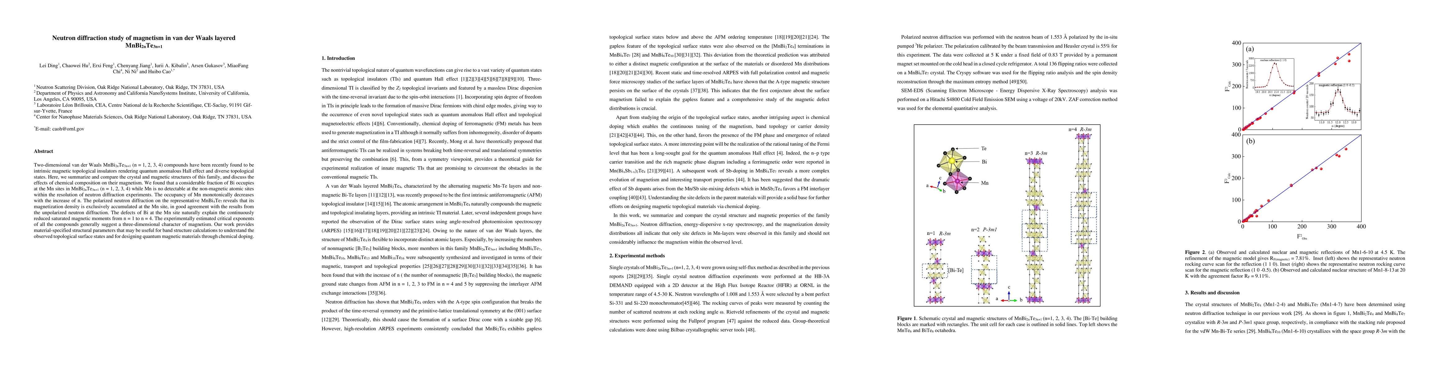 Two-dimensional van der Waals MnBi$_{2n}$Te$_{3n+1}$ (n = 1, 2, 3, 4) compounds have been recently found to be intrinsic magnetic topological insulators rendering quantum anomalous Hall effect and diverse topological states. Here, we summarize and compare the crystal and magnetic structures of this family, and discuss the effects of chemical composition on their magnetism. We found that a considerable fraction of Bi occupies at the Mn sites in MnBi$_{2n}$Te$_{3n+1}$ (n = 1, 2, 3, 4) while Mn is no detectable at the non-magnetic atomic sites within the resolution of neutron diffraction experiments. The occupancy of Mn monotonically decreases with the increase of n. The polarized neutron diffraction on the representative MnBi$_{4}$Te$_{7}$ reveals that its magnetization density is exclusively accumulated at the Mn site, in good agreement with the results from the unpolarized neutron diffraction. The defects of Bi at the Mn site naturally explain the continuously reduced saturated magnetic moments from n = 1 to n = 4. The experimentally estimated critical exponents of all the compounds generally suggest a three-dimensional character of magnetism. Our work provides material-specified structural parameters that may be useful for band structure calculations to understand the observed topological surface states and for designing quantum magnetic materials through chemical doping.