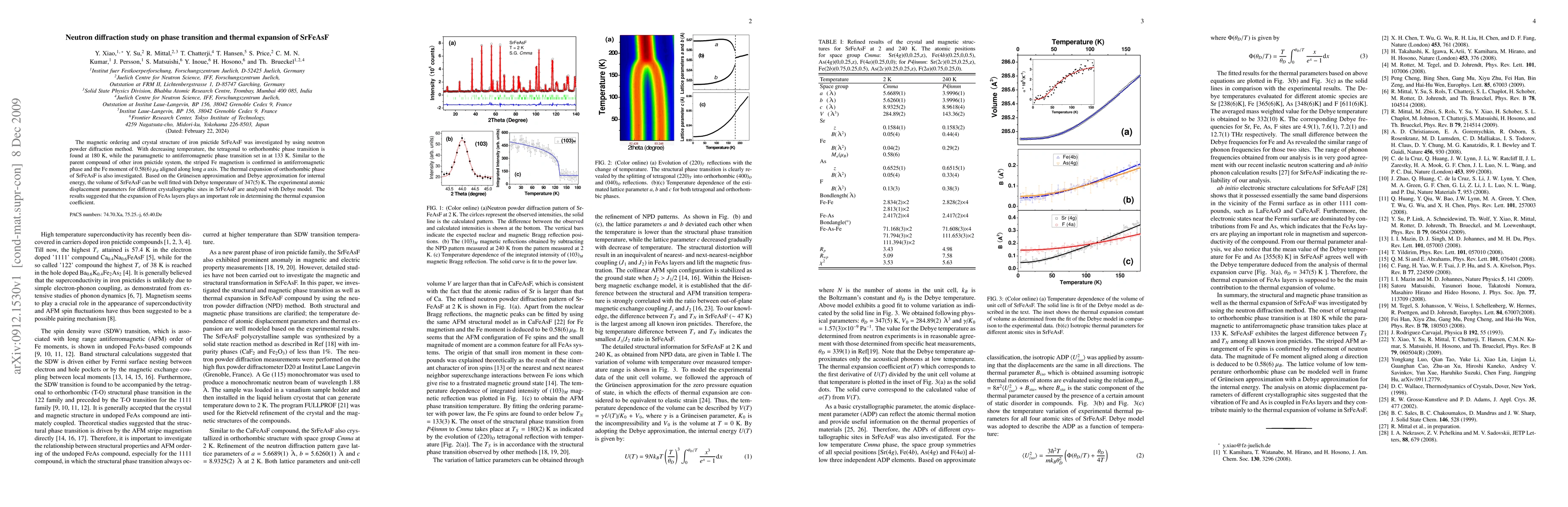 Neutron diffraction study reveals the phase transition of SrFeAsF from tetragonal to orthorhombic at 180 K and from paramagnetic to antiferromagnetic at 133 K, with Fe magnetism aligned along the a axis. The thermal expansion in the orthorhombic phase correlates with FeAs layers' expansion, fitting well with a Debye temperature of 347(5) K.