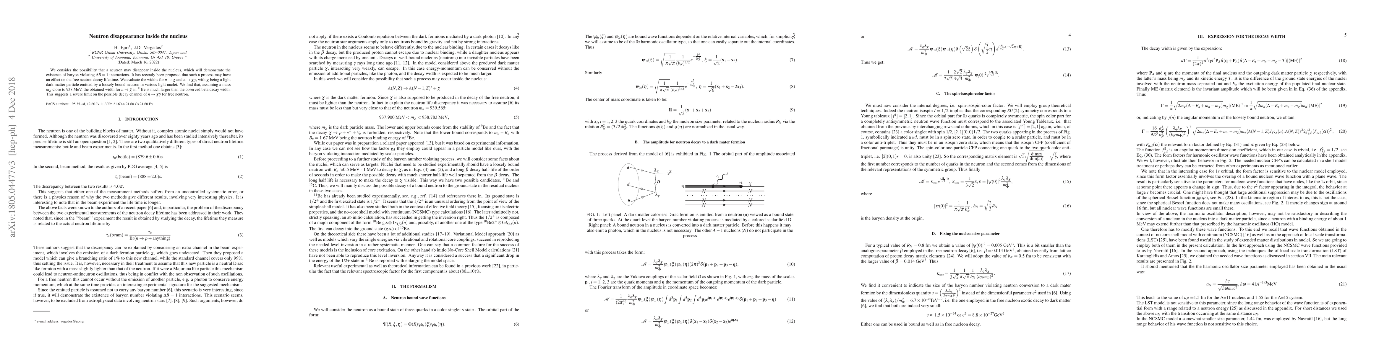 This paper investigates the potential for neutron disappearance within a nucleus, suggesting baryon-violating $\Delta B=1$ interactions. It finds that the decay width for a neutron transforming into a light dark matter particle in $^{11}$Be is significantly larger than the beta decay width, implying a strong constraint on the decay channel $n \rightarrow \chi \gamma$ for free neutrons.
