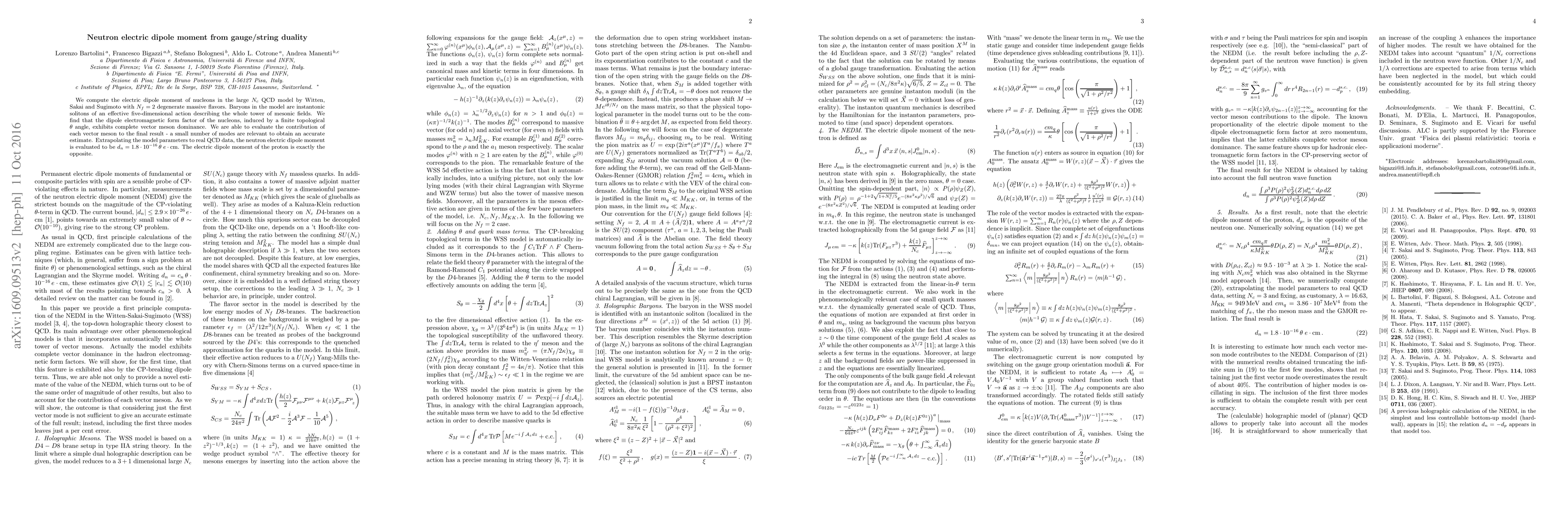 This paper calculates the neutron electric dipole moment in the large $N_c$ QCD model using gauge/string duality, finding that baryons are instantonic solitons. The neutron's electric dipole moment is estimated to be $d_n = 1.8 \cdot 10^{-16}\, \theta\;e\cdot \mathrm{cm}$, with the proton's dipole moment being the opposite in sign.