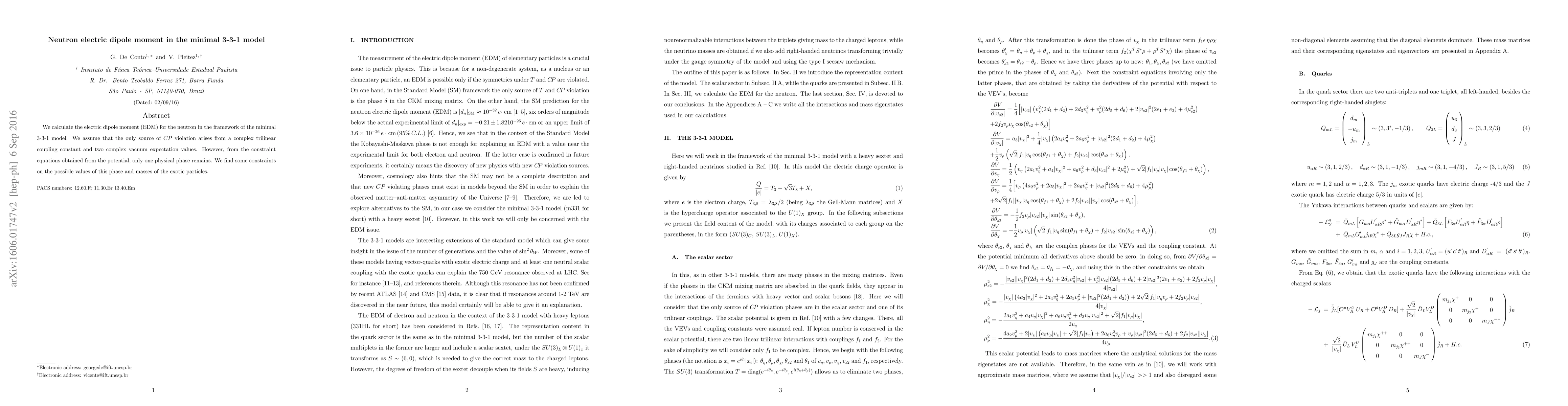 This paper calculates the neutron electric dipole moment (EDM) in the minimal 3-3-1 model, identifying that only one physical phase contributes to CP violation, and derives constraints on this phase and the masses of exotic particles.
