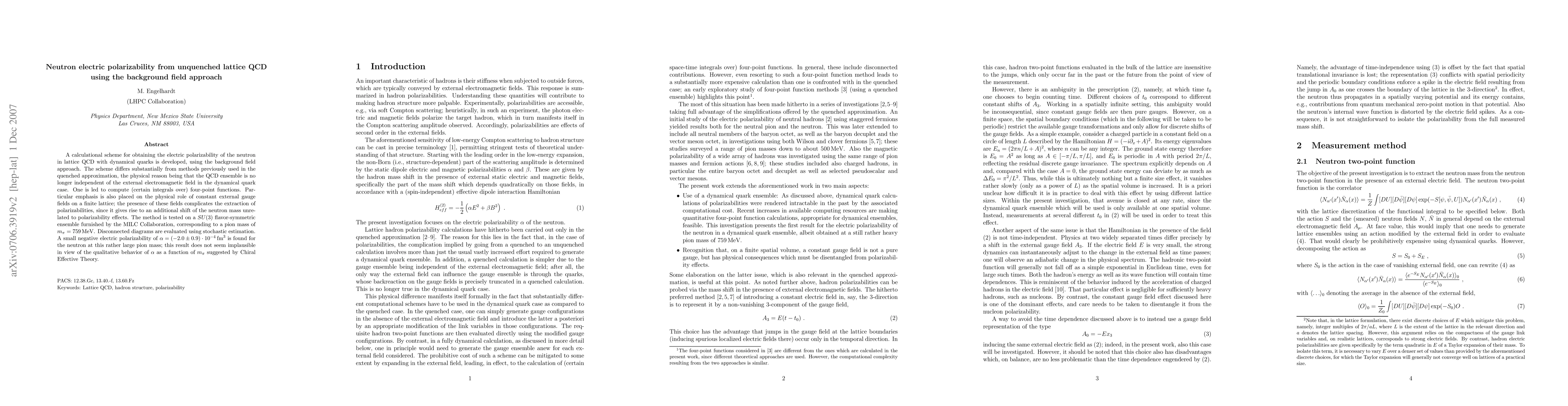 This paper develops a new method for calculating the neutron's electric polarizability using unquenched lattice QCD with the background field approach. The authors find a small negative polarizability of α = (-2.0 ± 0.9) × 10^(-4) fm^3, which aligns with Chiral Effective Theory predictions for large pion masses.