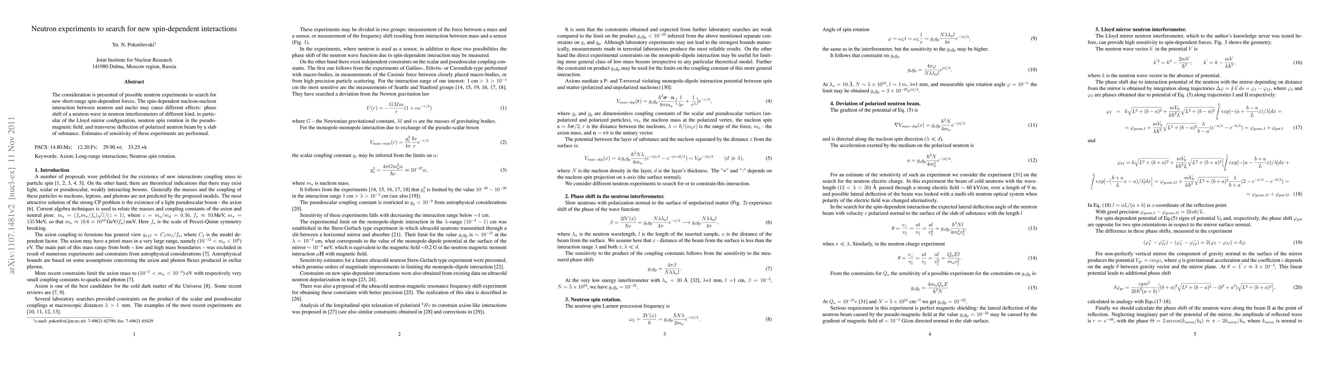 The consideration is presented of possible neutron experiments to search for new short-range spin-dependent forces. The spin-dependent nucleon-nucleon interaction between neutron and nuclei may cause different effects: phase shift of a neutron wave in neutron interferometers of different kind, in particular of the Lloyd mirror configuration, neutron spin rotation in the pseudo-magnetic field, and transverse deflection of polarized neutron beam by a slab of substance. Estimates of sensitivity of these experiments are performed.