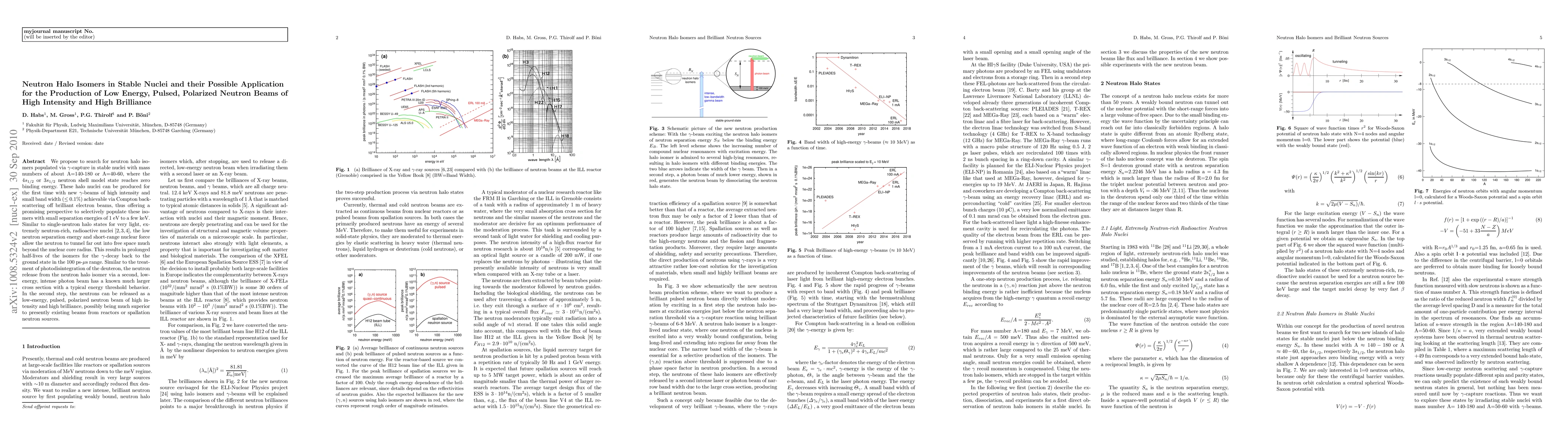 We propose to search for neutron halo isomers populated via $\gamma$-capture in stable nuclei with mass numbers of about A=140-180 or A=40-60, where the $4s_{1/2}$ or $3s_{1/2}$ neutron shell model state reaches zero binding energy. These halo nuclei can be produced for the first time with new $\gamma$-beams of high intensity and small band width ($\le$ 0.1%) achievable via Compton back-scattering off brilliant electron beams thus offering a promising perspective to selectively populate these isomers with small separation energies of 1 eV to a few keV. Similar to single-neutron halo states for very light, extremely neutron-rich, radioactive nuclei \cite{hansen95,tanihata96,aumann00}, the low neutron separation energy and short-range nuclear force allows the neutron to tunnel far out into free space much beyond the nuclear core radius. This results in prolonged half lives of the isomers for the $\gamma$-decay back to the ground state in the 100 ps-$\mu$s range. Similar to the treatment of photodisintegration of the deuteron, the neutron release from the neutron halo isomer via a second, low-energy, intense photon beam has a known much larger cross section with a typical energy threshold behavior. In the second step, the neutrons can be released as a low-energy, pulsed, polarized neutron beam of high intensity and high brilliance, possibly being much superior to presently existing beams from reactors or spallation neutron sources.