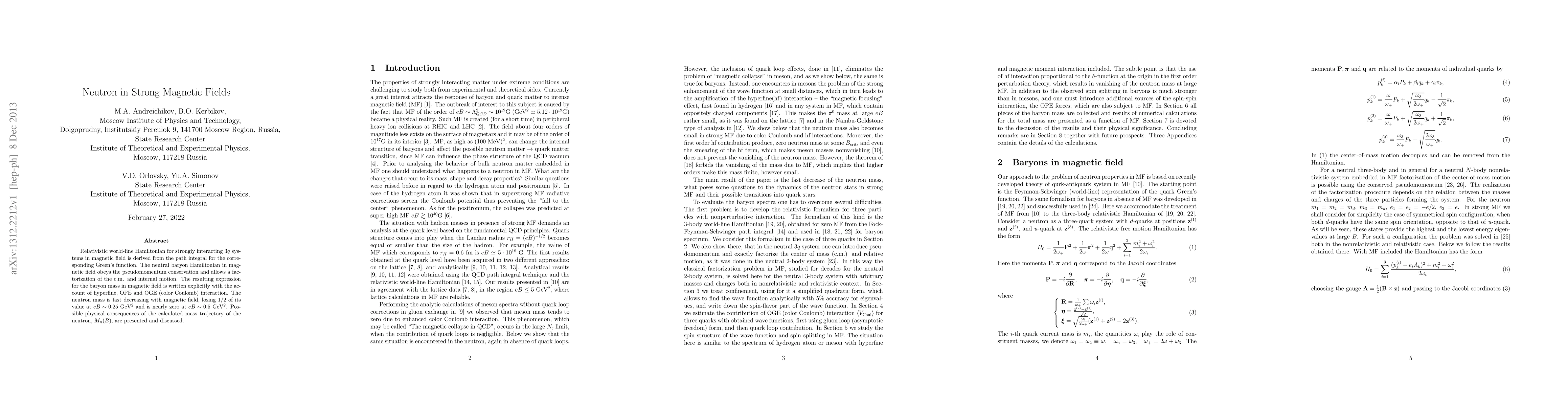 Relativistic world-line Hamiltonian for strongly interacting 3q systems in magnetic field is derived from the path integral for the corresponding Green's function. The neutral baryon Hamiltonian in magnetic field obeys the pseudomomentum conservation and allows a factorization of the c.m. and internal motion. The resulting expression for the baryon mass in magnetic field is written explicitly with the account of hyperfine, OPE and OGE (color Coulomb) interaction. The neutron mass is fast decreasing with magnetic field, losing 1/2 of its value at eB~0.25 GeV^2 and is nearly zero at eB~0.5 GeV^2. Possible physical consequences of the calculated mass trajectory of the neutron, M_n(B), are presented and discussed.