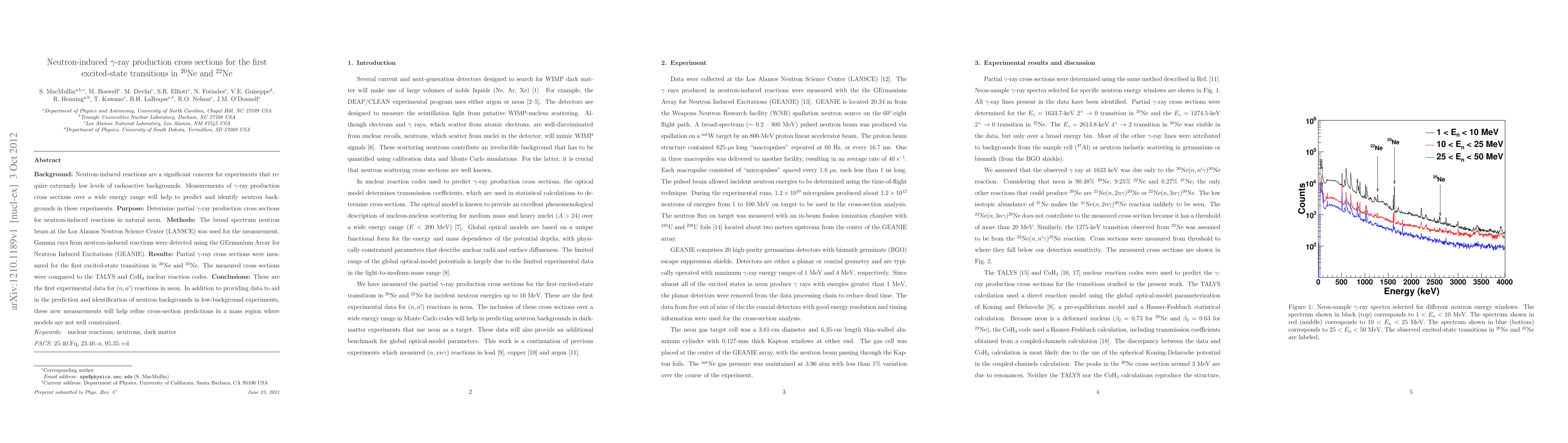 This study measures neutron-induced gamma-ray production cross sections for the first excited-state transitions in Ne-20 and Ne-22 using a broad-spectrum neutron beam at LANSCE. The results provide new experimental data for (n,n') reactions in neon, aiding in the prediction of neutron backgrounds and refining nuclear reaction models.