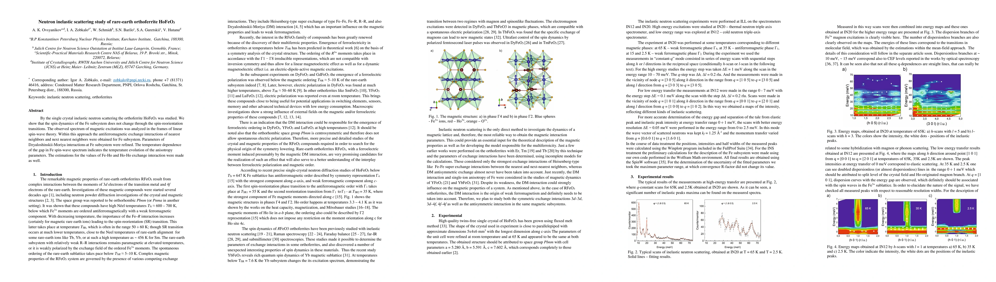 Researchers used neutron inelastic scattering to study HoFeO3, finding that spin dynamics of the Fe subsystem remain consistent across spin-reorientation transitions. The analysis revealed temperature-dependent changes in the material's anisotropy parameters and exchange interactions.