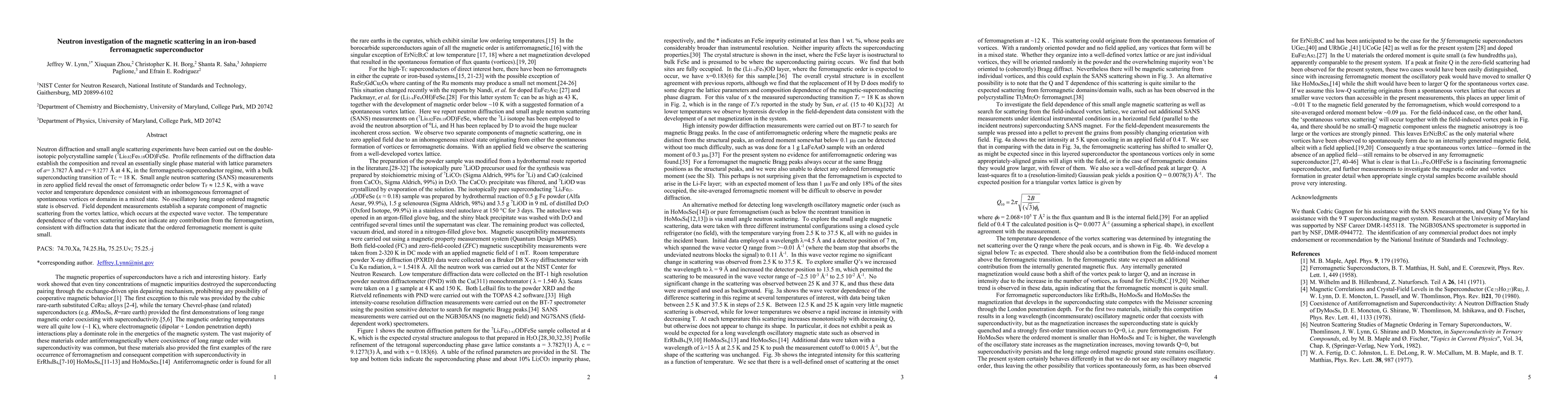 Neutron diffraction and small angle scattering experiments have been carried out on the double-isotopic polycrystalline sample (7Li0.82Fe0.18OD)FeSe. Profile refinements of the diffraction data establish the composition and reveal an essentially single phase material with lattice parameters of a= 3.7827 {\AA} and c= 9.1277 {\AA} at 4 K, in the ferromagnetic-superconductor regime, with a bulk superconducting transition of TC = 18 K. Small angle neutron scattering (SANS) measurements in zero applied field reveal the onset of ferromagnetic order below TF ~ 12.5 K, with a wave vector and temperature dependence consistent with an inhomogeneous ferromagnet of spontaneous vortices or domains in a mixed state. No oscillatory long range ordered magnetic state is observed. Field dependent measurements establish a separate component of magnetic scattering from the vortex lattice, which occurs at the expected wave vector. The temperature dependence of the vortex scattering does not indicate any contribution from the ferromagnetism, consistent with diffraction data that indicate that the ordered ferromagnetic moment is quite small.
