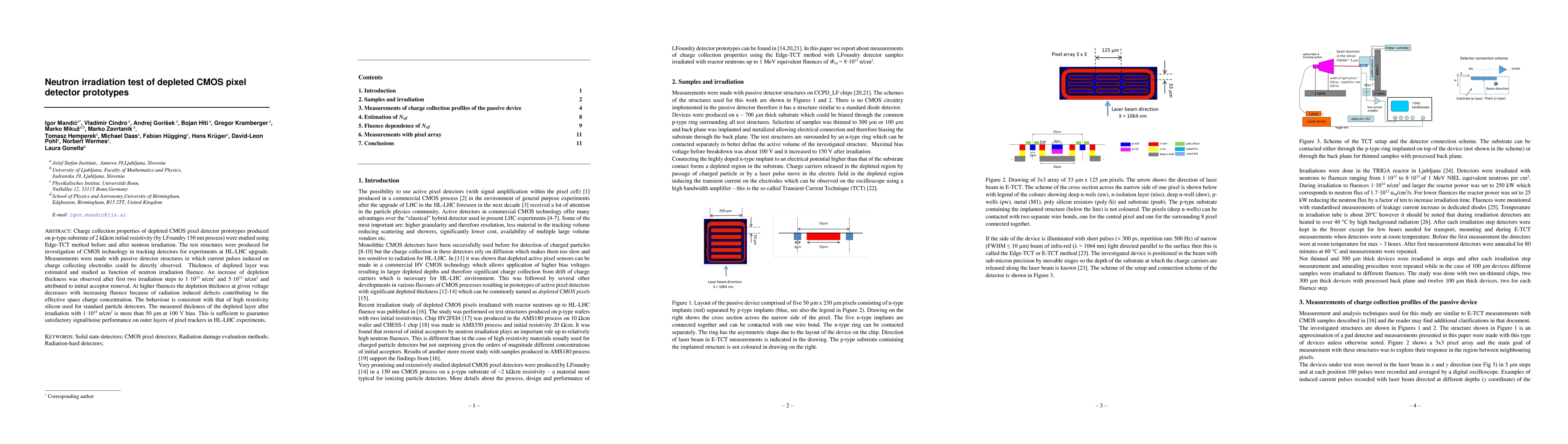 This study investigates the charge collection properties of depleted CMOS pixel detectors after neutron irradiation, showing an increase in depletion thickness at lower fluences due to acceptor removal, while higher fluences lead to a decrease in thickness due to radiation-induced defects. The results indicate sufficient performance for outer layers in HL-LHC experiments.