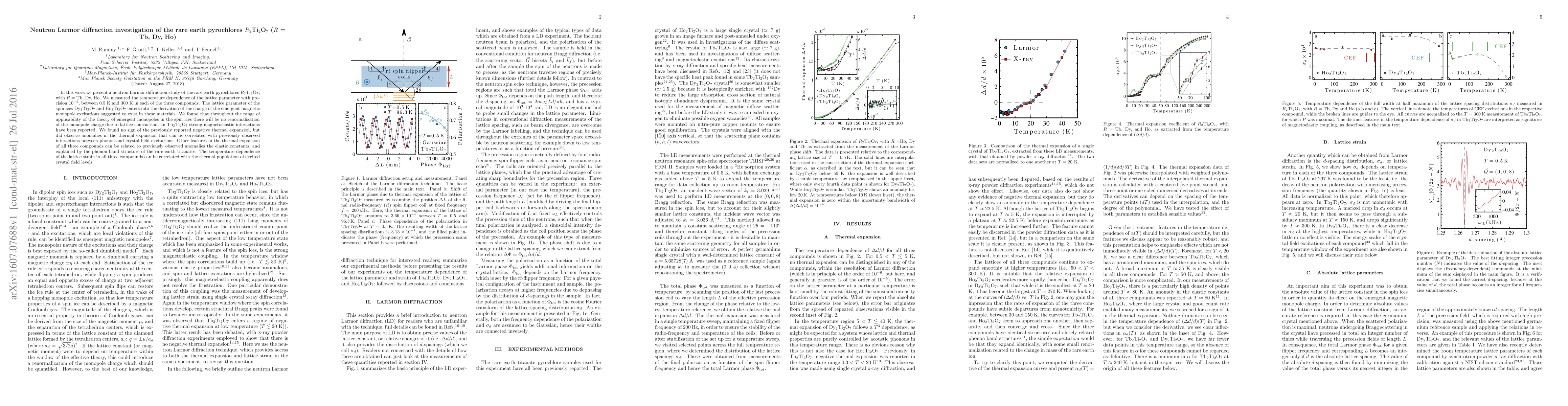 This study uses neutron Larmor diffraction to investigate the temperature dependence of the lattice parameters in rare earth pyrochlores $R_2$Ti$_2$O$_7$ ($R$ = Tb, Dy, Ho). The findings indicate no renormalization of monopole charge in Dy$_2$Ti$_2$O$_7$ and Ho$_2$Ti$_2$O$_7$, and anomalies in Tb$_2$Ti$_2$O$_7$'s thermal expansion correlate with magnetoelastic interactions.