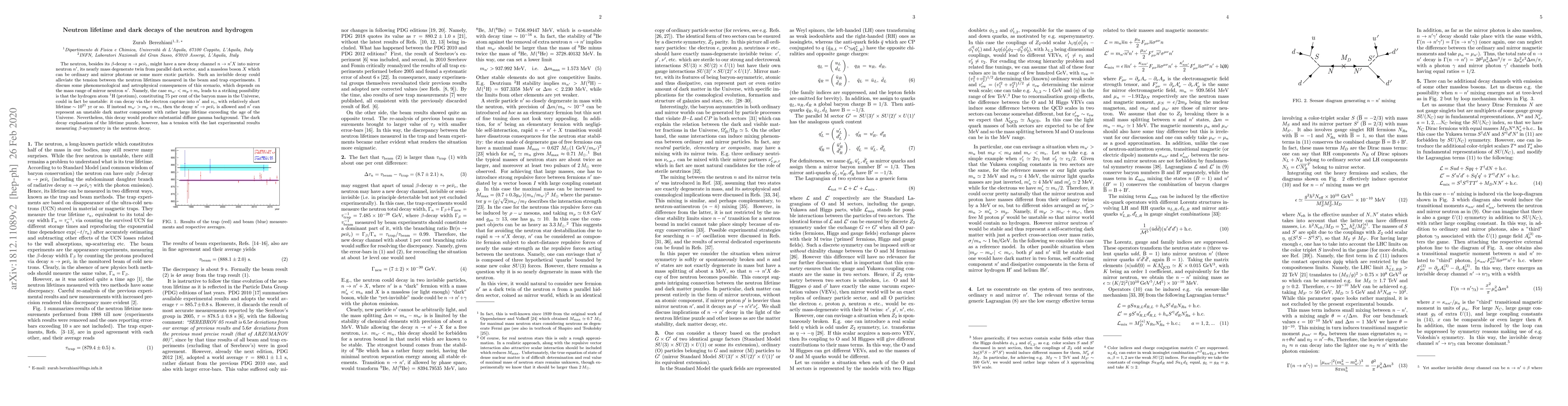 The neutron, besides its $\beta$-decay $n\to p e\bar\nu_e$, might have a new decay channel $n\to n' X$ into mirror neutron $n'$, its nearly mass degenerate twin from parallel dark sector, and a massless boson $X$ which can be ordinary and mirror photons or some more exotic particle. Such an invisible decay could alleviate the tension between the neutron lifetimes measured in the beam and trap experiments. I discuss some phenomenological and astrophysical consequences of this scenario, which depends on the mass range of mirror neutron $n'$. Namely, the case $m_{n'} < m_p + m_e$ leads to a striking possibility is that the hydrogen atom $^1$H (protium), constituting 75 per cent of the baryon mass in the Universe, could in fact be unstable: it can decay via the electron capture into $n'$ and $\nu_e$, with relatively short lifetime $\sim 10^{21}$ yr or so. If instead $m_{n'} > m_p + m_e$, then the decay $n'\to pe\bar \nu_e$ is allowed and $n'$ can represent an unstable dark matter component with rather large lifetime exceeding the age of the Universe. Nevertheless, this decay would produce substantial diffuse gamma background. The dark decay explanation of the lifetime puzzle, however, has a tension with the last experimental results measuring $\beta$-asymmetry in the neutron decay.