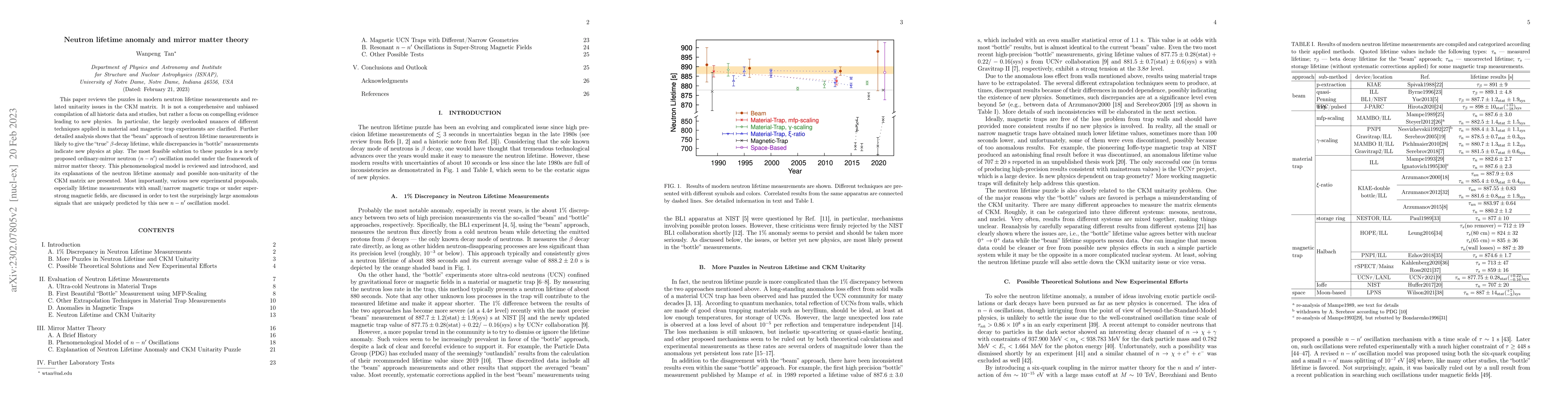 This paper reviews the puzzles in modern neutron lifetime measurements and related unitarity issues in the CKM matrix. It is not a comprehensive and unbiased compilation of all historic data and studies, but rather a focus on compelling evidence leading to new physics. In particular, the largely overlooked nuances of different techniques applied in material and magnetic trap experiments are clarified. Further detailed analysis shows that the ``beam'' approach of neutron lifetime measurements is likely to give the ``true'' $\beta$-decay lifetime, while discrepancies in ``bottle'' measurements indicate new physics at play. The most feasible solution to these puzzles is a newly proposed ordinary-mirror neutron ($n-n'$) oscillation model under the framework of mirror matter theory. This phenomenological model is reviewed and introduced, and its explanations of the neutron lifetime anomaly and possible non-unitarity of the CKM matrix are presented. Most importantly, various new experimental proposals, especially lifetime measurements with small/narrow magnetic traps or under super-strong magnetic fields, are discussed in order to test the surprisingly large anomalous signals that are uniquely predicted by this new $n-n'$ oscillation model.