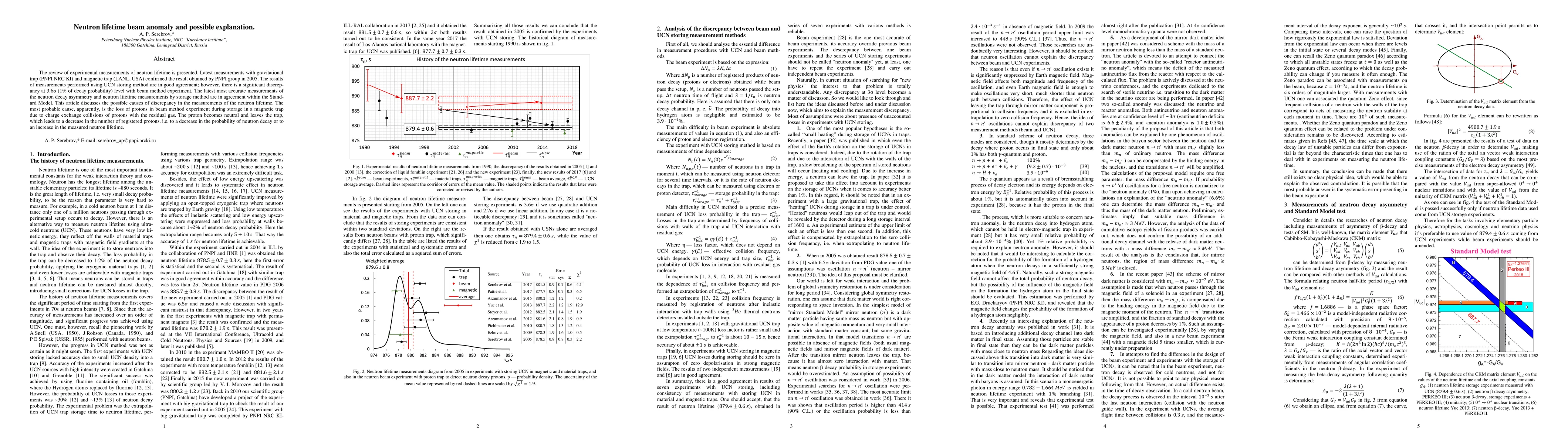 The review of experimental measurements of neutron lifetime is presented. Latest measurements with gravitational trap (PNPI NRC KI) and magnetic trap (LANL, USA) confirmed the result obtained by PNPI group in 2005. The results of measurements performed using UCN storing method are in good agreement; however, there is a significant discrepancy at 3.6{\sigma} (1% of decay probability) level with beam method experiment. The latest most accurate measurements of the neutron decay asymmetry and neutron lifetime measurements by storage method are in agreement within the Standard Model. This article discusses the possible causes of discrepancy in the measurements of the neutron lifetime. The most probable cause, apparently, is the loss of protons in beam method experiment during storage in a magnetic trap due to charge exchange collisions of protons with the residual gas. The proton becomes neutral and leaves the trap, which leads to a decrease in the number of registered protons, i.e. to a decrease in the probability of neutron decay or to an increase in the measured neutron lifetime.