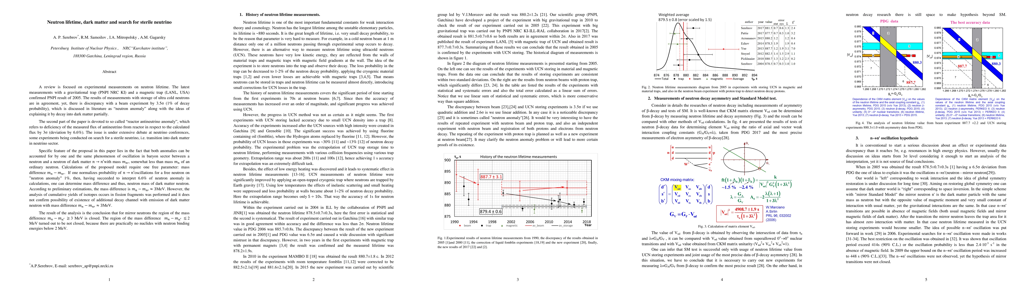A review is focused on experimental measurements on neutron lifetime. The latest measurements with a gravitational trap (PNPI NRC KI) and a magnetic trap (LANL, USA) confirmed PNPI result of 2005. The results of measurements with storage of ultra cold neutrons are in agreement, yet, there is discrepancy with a beam experiment by $3.5{\sigma}$ (1% of decay probability), which is discussed in literature as "neutron anomaly" along with the ideas of explaining it by decay into dark matter partially. The second part of the paper is devoted to so called "reactor antineutrino anomaly", which refers to deficiency of the measured flux of antineutrino from reactor in respect to the calculated flux by $3{\sigma}$(deviation by 6.6%). Specific feature of the proposal in this paper lies in the fact that both anomalies can be accounted for by one and the same phenomenon of oscillation in baryon sector between a neutron and a neutron of dark matter $n{\rightarrow}n'$ with mass $m_{n'}$, somewhat less than mass $m_n$ of an ordinary neutron. Calculations of the proposed model require one free parameter: mass difference $m_n-m_{n'}$ if one normalizes probability of oscillations for a free neutron on "neutron anomaly" 1%, then, having succeeded to interpret 6.6% of neutron anomaly in calculations, one can determine mass difference. According to preliminary estimations, the mass difference is $m_n-m_{n'}{\approx}$ 3 MeV. However, the analysis of cumulative yields of isotopes occurs in fission fragments was performed and it does not confirm possibility of existence of additional decay channel with emission of dark matter neutron with mass difference $m_n-m_{n'}{\approx}$ 3 MeV. The result of the analysis is the conclusion that for mirror neutrons the region of the mass difference $m_n-m_{n'} {\geq}$ 3 MeV is closed. The region of the mass difference $m_n-m_{n'}{\leq}$ 2 MeV turned out to be not closed.