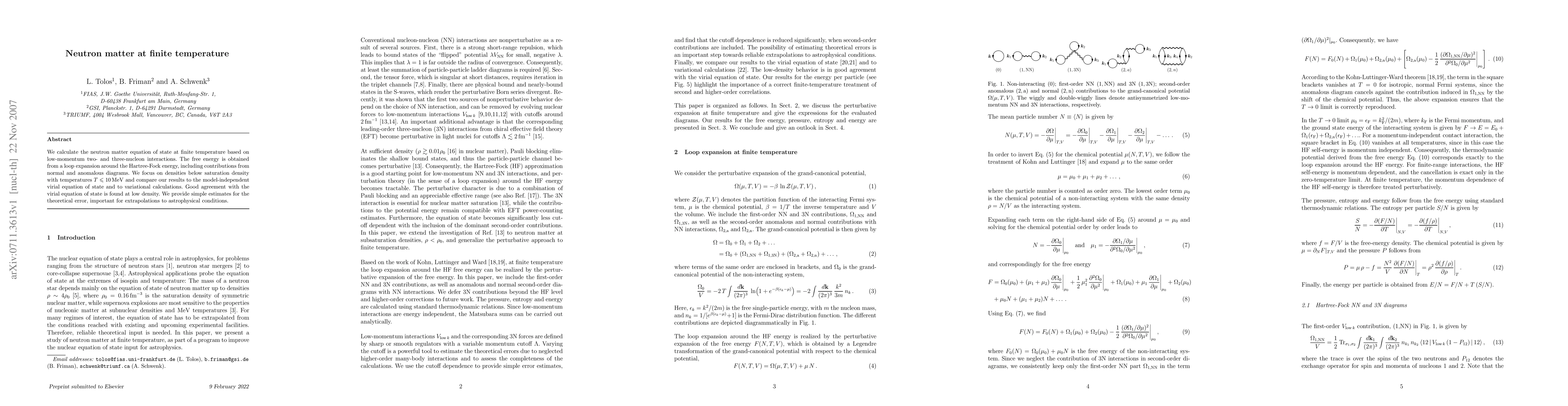 We calculate the neutron matter equation of state at finite temperature based on low-momentum two- and three-nucleon interactions. The free energy is obtained from a loop expansion around the Hartree-Fock energy, including contributions from normal and anomalous diagrams. We focus on densities below saturation density with temperatures T <= 10 MeV and compare our results to the model-independent virial equation of state and to variational calculations. Good agreement with the virial equation of state is found at low density. We provide simple estimates for the theoretical error, important for extrapolations to astrophysical conditions.