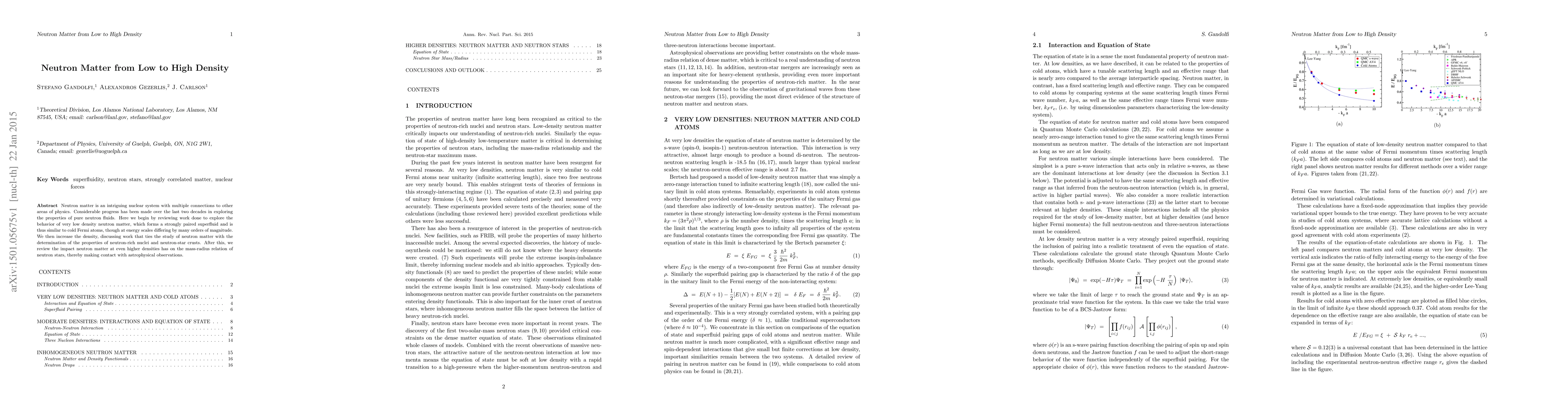 This paper reviews the properties of neutron matter from low to high densities, starting with its behavior as a superfluid at low densities and linking it to cold Fermi atoms. It further explores the implications of neutron-rich nuclei and neutron-star crusts at higher densities, concluding with the impact on the mass-radius relation of neutron stars, relevant for astrophysical observations.