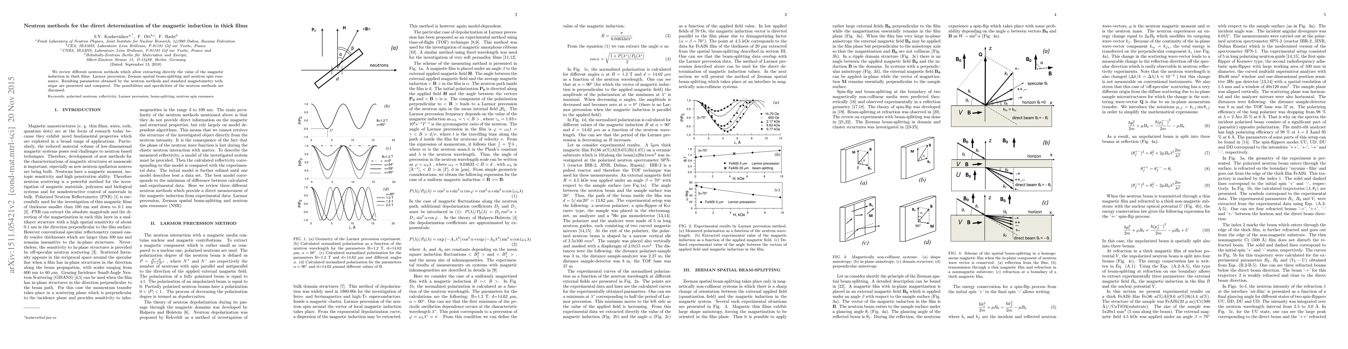 We review different neutron methods which allow extracting directly the value of the magnetic induction in thick films: Larmor precession, Zeeman spatial beam-splitting and neutron spin resonance. Resulting parameters obtained by the neutron methods and standard magnetometry technique are presented and compared. The possibilities and specificities of the neutron methods are discussed.