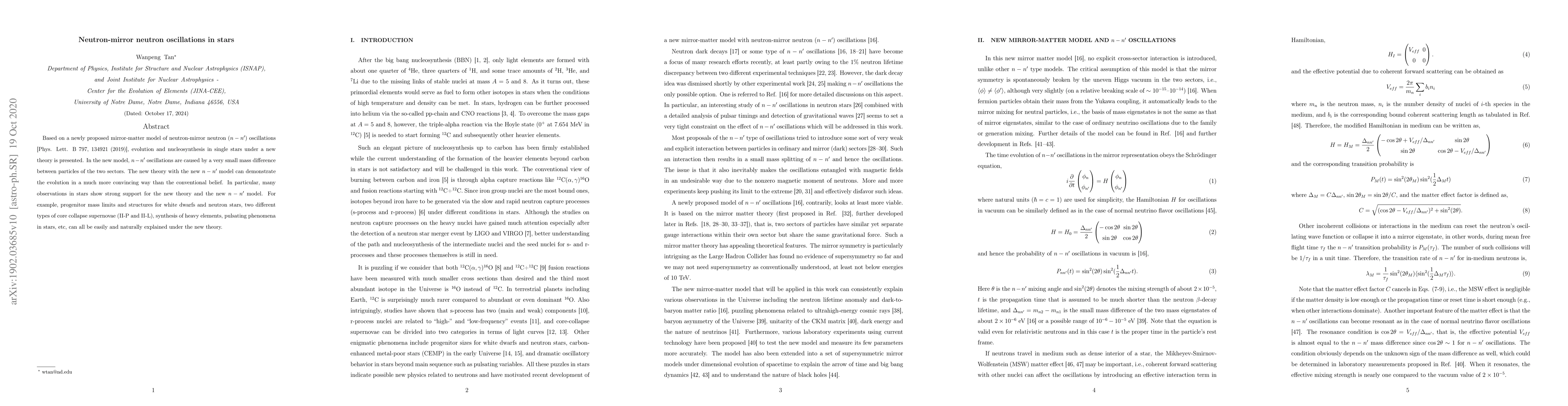 This paper explores neutron-mirror neutron ($n-n'$) oscillations in stars based on a new mirror-matter model, demonstrating that these oscillations, driven by a small mass difference, provide a more convincing explanation for stellar evolution and nucleosynthesis than conventional theories. The new model effectively explains various stellar phenomena, including progenitor mass limits, supernova types, and heavy element synthesis.