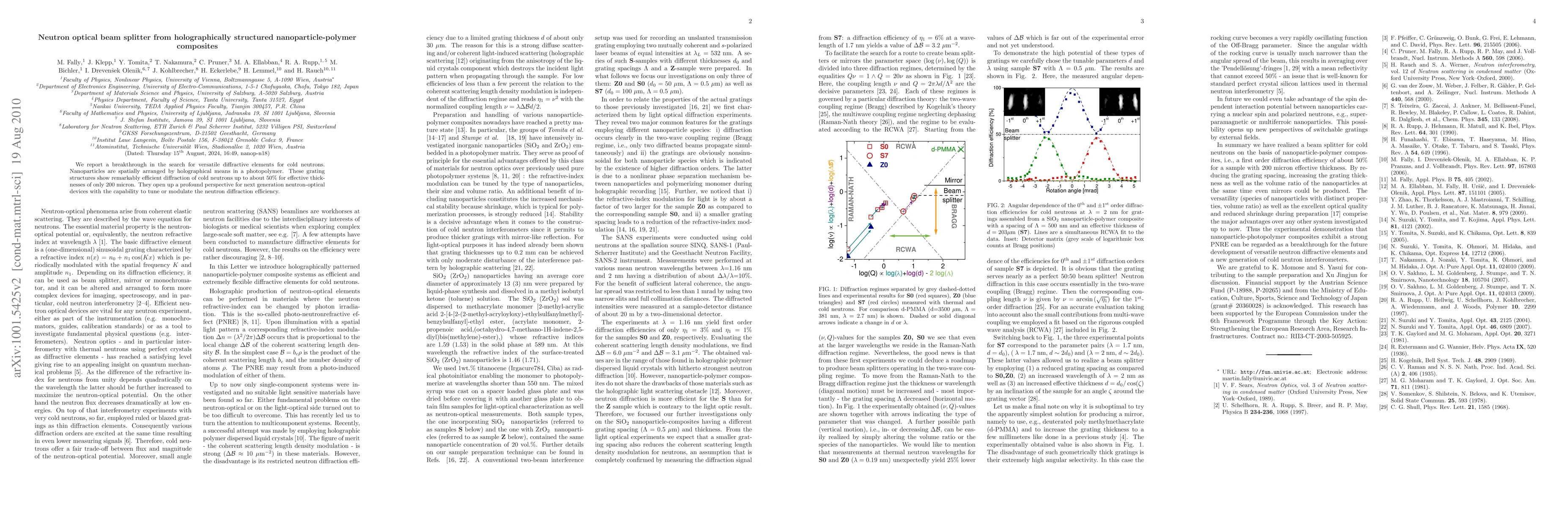 Researchers created a neutron optical beam splitter using holographically structured nanoparticles in polymers, achieving 50% efficient diffraction of cold neutrons with only 200 micron thickness.