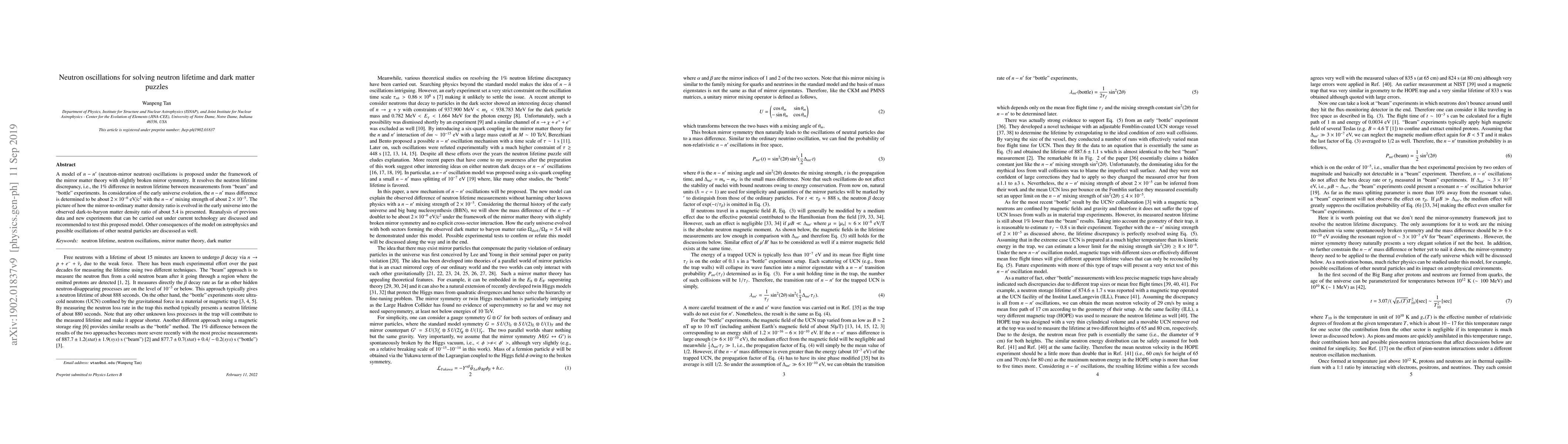 This paper proposes a model of neutron-mirror neutron oscillations to resolve discrepancies in neutron lifetime measurements and to explain the dark matter density ratio. It suggests a small mass difference and mixing strength, and recommends new experiments to test the model.