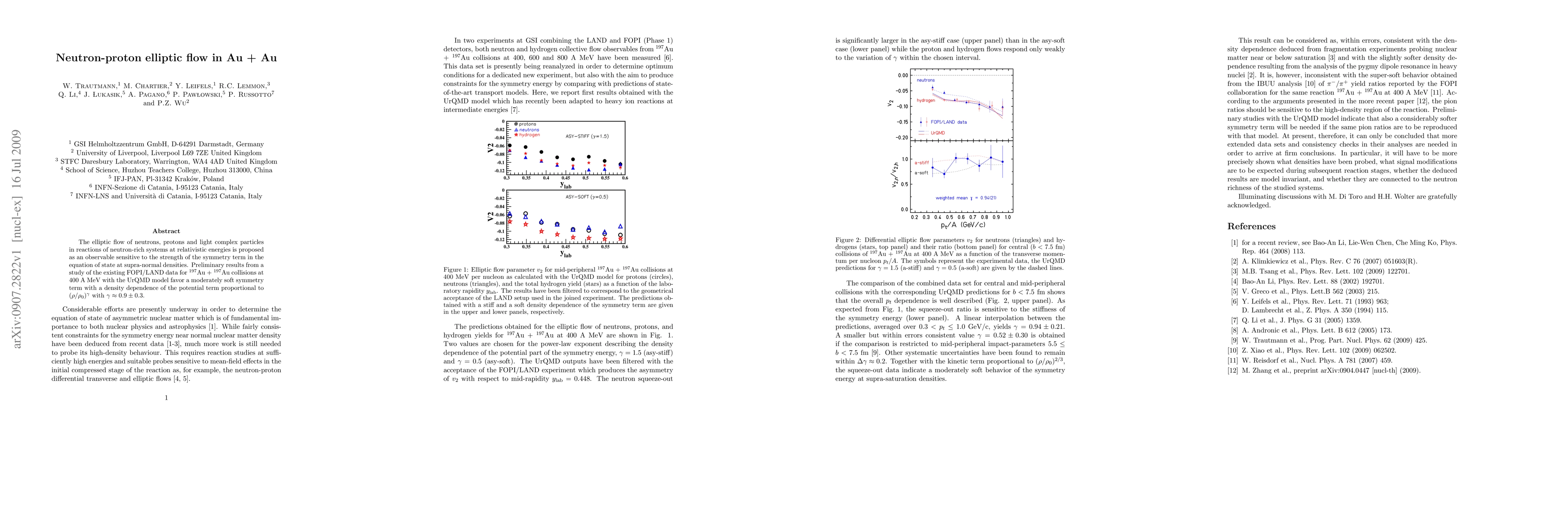 This paper investigates neutron-proton elliptic flow in Au+Au collisions to probe the symmetry term's strength in the equation of state at supra-normal densities. Preliminary results from FOPI/LAND data suggest a moderately soft symmetry term with a density dependence of γ = 0.9 ± 0.3.