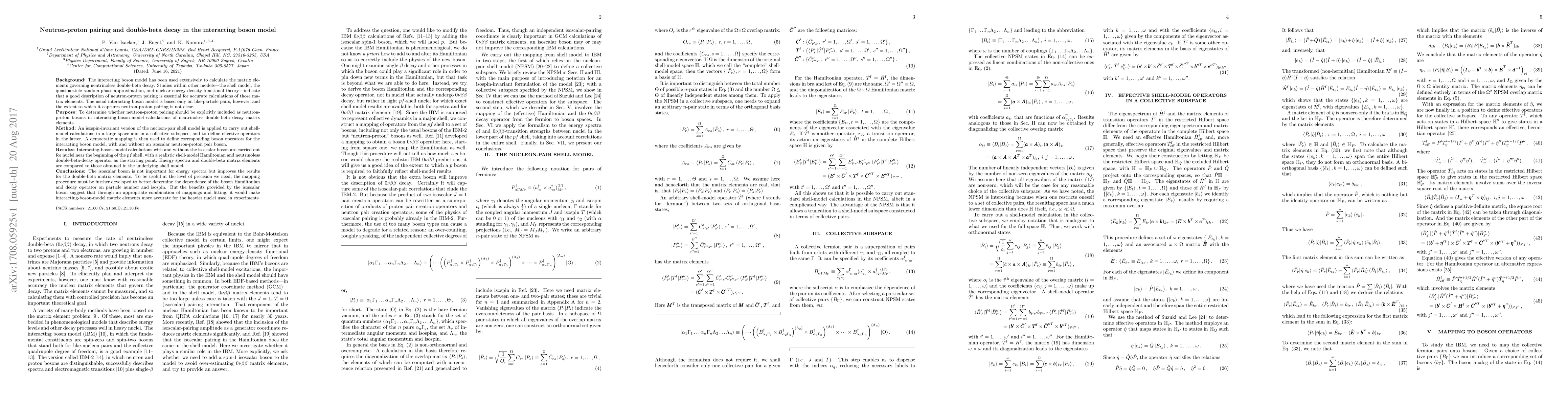 Background: The interacting boson model (IBM) has been used extensively to calculate the matrix elements governing neutrinoless double-beta decay. Studies within other models indicate that a good description of neutron-proton pairing is essential for accurate calculations of those matrix elements. The usual interacting boson model is based only on like-particle pairs, however, and the extent to which it captures neutron-proton pairing is not clear. Purpose: To determine whether neutron-proton pairing should be explicitly included as neutron-proton bosons in IBM calculations of neutrinoless double-beta decay matrix elements. Method: An isospin-invariant version of the nucleon-pair shell model is applied to carry out shell-model calculations in a large space and in a collective subspace, and to define effective operators in the latter. A democratic mapping is then used to define corresponding boson operators for the IBM, with and without an isoscalar neutron-proton pair boson. Results: IBM calculations with and without the isoscalar boson are carried out for nuclei near the beginning of the $pf$ shell, with a realistic shell-model Hamiltonian and neutrinoless double-beta-decay operator as the starting point. Energy spectra and double-beta matrix elements are compared to those obtained in the underlying shell model. Conclusions: The isoscalar boson does not improve energy spectra but does improve double-beta matrix elements. To be useful at the level of precision we need, the mapping procedure must be further developed to better determine the dependence of the boson Hamiltonian and decay operator on particle number and isospin. But the benefits provided by the isoscalar boson suggest that through an appropriate combination of mappings and fitting, it would make IBM matrix elements more accurate for the heavier nuclei used in experiments.