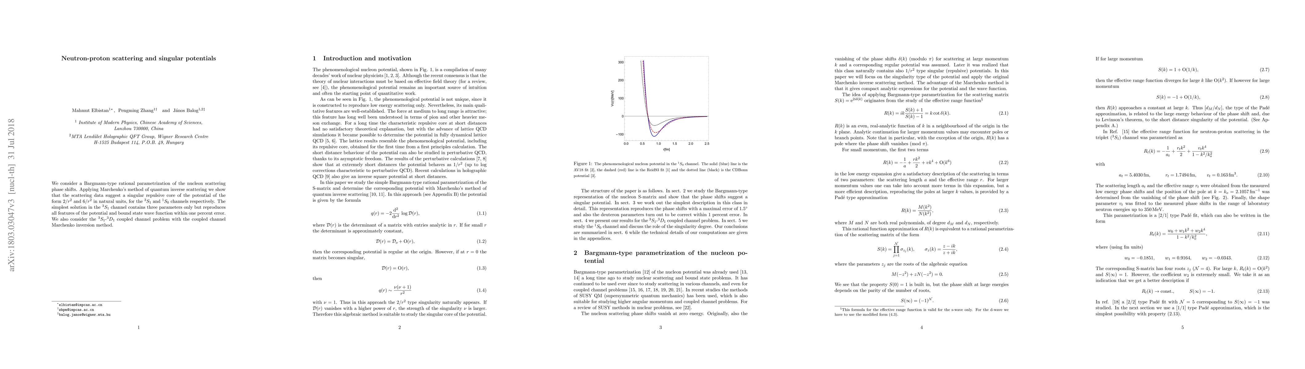 We consider a Bargmann-type rational parametrization of the nucleon scattering phase shifts. Applying Marchenko's method of quantum inverse scattering we show that the scattering data suggest a singular repulsive core of the potential of the form $2/r^2$ and $6/r^2$ in natural units, for the ${}^3S_1$ and ${}^1S_0$ channels respectively. The simplest solution in the ${}^3S_1$ channel contains three parameters only but reproduces all features of the potential and bound state wave function within one percent error. We also consider the ${}^3S_1$-${}^3D_1$ coupled channel problem with the coupled channel Marchenko inversion method.
