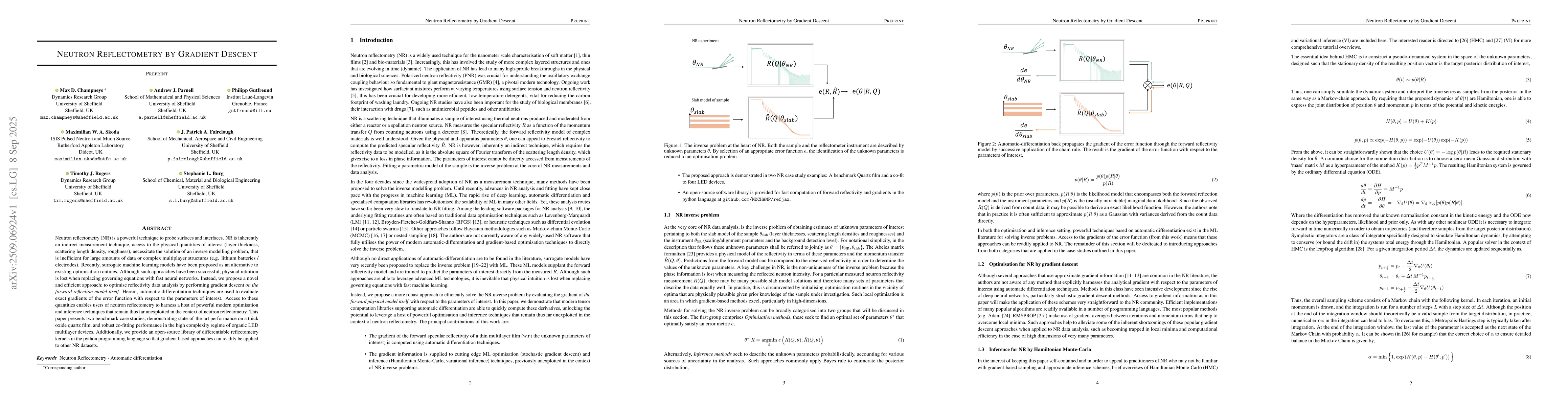 Neutron reflectometry (NR) is a powerful technique to probe surfaces and interfaces. NR is inherently an indirect measurement technique, access to the physical quantities of interest (layer thickness, scattering length density, roughness), necessitate the solution of an inverse modelling problem, that is inefficient for large amounts of data or complex multiplayer structures (e.g. lithium batteries / electrodes). Recently, surrogate machine learning models have been proposed as an alternative to existing optimisation routines. Although such approaches have been successful, physical intuition is lost when replacing governing equations with fast neural networks. Instead, we propose a novel and efficient approach; to optimise reflectivity data analysis by performing gradient descent on the forward reflection model itself. Herein, automatic differentiation techniques are used to evaluate exact gradients of the error function with respect to the parameters of interest. Access to these quantities enables users of neutron reflectometry to harness a host of powerful modern optimisation and inference techniques that remain thus far unexploited in the context of neutron reflectometry. This paper presents two benchmark case studies; demonstrating state-of-the-art performance on a thick oxide quartz film, and robust co-fitting performance in the high complexity regime of organic LED multilayer devices. Additionally, we provide an open-source library of differentiable reflectometry kernels in the python programming language so that gradient based approaches can readily be applied to other NR datasets.