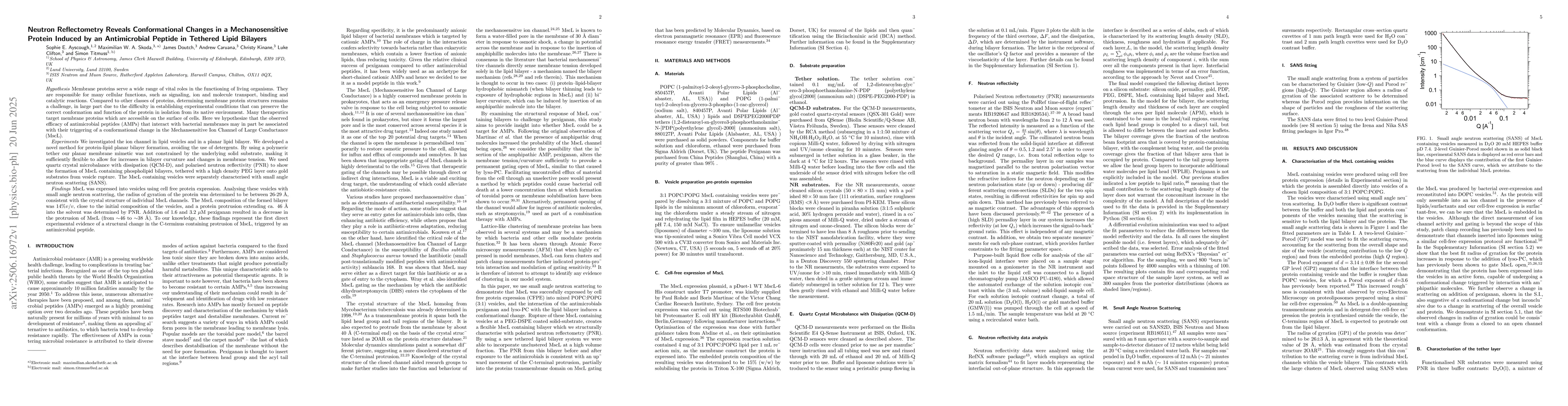 Membrane proteins serve a wide range of vital roles in the functioning of living organisms. Compared to other classes of proteins, determining membrane protein structures remains a challenge, in large part due to the difficulty in establishing experimental conditions that can preserve the correct conformation and function of the protein in isolation from its native environment. We investigated the ion channel in lipid vesicles and in a planar lipid bilayer. By using a polymeric tether our planar membrane mimetic was not constrained by the underlying solid substrate, making it sufficiently flexible to allow for increases in bilayer curvature and changes in membrane tension. We used quartz crystal microbalance with dissipation (QCM-D), and polarised neutron reflectivity (PNR) to show the formation of MscL containing phospholipid bilayers, tethered with a high density PEG layer onto gold substrates from vesicle rupture. The MscL containing vesicles were separately characterised with small angle neutron scattering (SANS). MscL was expressed into vesicles using cell free protein expression. Analysing these vesicles with small angle neutron scattering, the radius of gyration of the protein was determined to be between 26-29~\AA{}, consistent with the crystal structure of individual MscL channels. The MscL composition of the formed bilayer was 14\%$v/v$, close to the initial composition of the vesicles, and a protein protrusion extending ca. 46~\AA{} into the solvent was determined by PNR. Addition of 1.6 and 3.2 $\mu$M pexiganan resulted in a decrease in the protrusion of MscL (from $\sim$46 to $\sim$38~\AA{}). To our knowledge, these findings represent the first direct experimental evidence of a structural change in the C-terminus containing protrusion of MscL, triggered by an antimicrobial peptide.