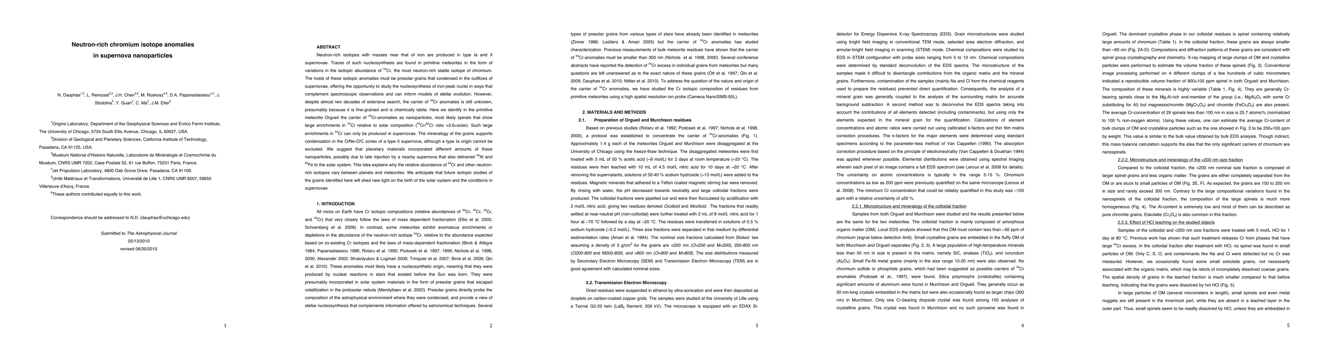 This research identifies nanoparticles in the Orgueil meteorite as the carriers of 54Cr anomalies, likely spinels with significant 54Cr enrichments produced in supernovae. These findings suggest a supernova origin for the isotopic variations and imply late-stage supernova influence on planetary materials.