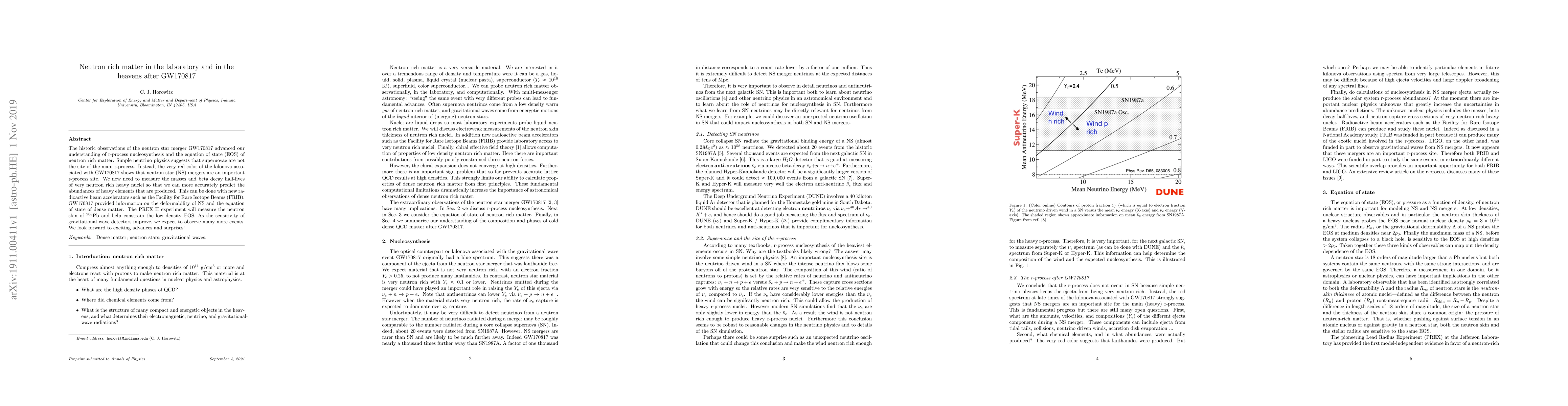 The historic observations of the neutron star merger GW170817 advanced our understanding of r-process nucleosynthesis and the equation of state (EOS) of neutron rich matter. Simple neutrino physics suggests that supernovae are not the site of the main r-process. Instead, the very red color of the kilonova associated with GW170817 shows that neutron star (NS) mergers are an important r-process site. We now need to measure the masses and beta decay half-lives of very neutron rich heavy nuclei so that we can more accurately predict the abundances of heavy elements that are produced. This can be done with new radioactive beam accelerators such as the Facility for Rare Isotope Beams (FRIB). GW170817 provided information on the deformability of NS and the equation of state of dense matter. The PREX II experiment will measure the neutron skin of ${}^{208}$Pb and help constrain the low density EOS. As the sensitivity of gravitational wave detectors improve, we expect to observe many more events. We look forward to exciting advances and surprises!
