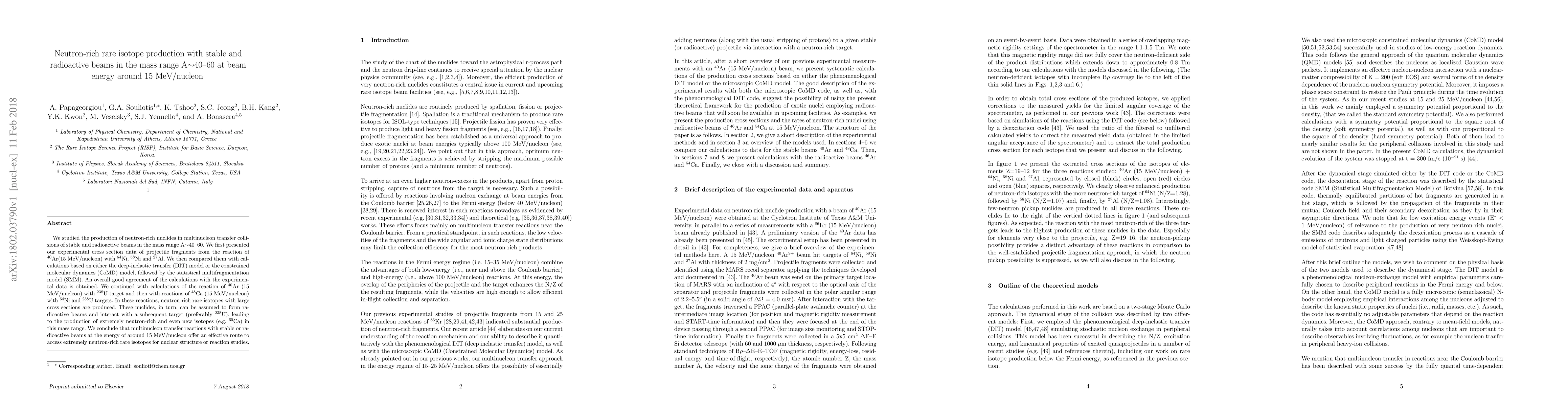 This research investigates the production of neutron-rich rare isotopes via multinucleon transfer reactions using stable and radioactive beams in the mass range A=40-60 at 15 MeV/nucleon. Experimental data and theoretical models show good agreement, indicating that such reactions can effectively produce neutron-rich isotopes, which may further interact to create even more neutron-rich or new isotopes.