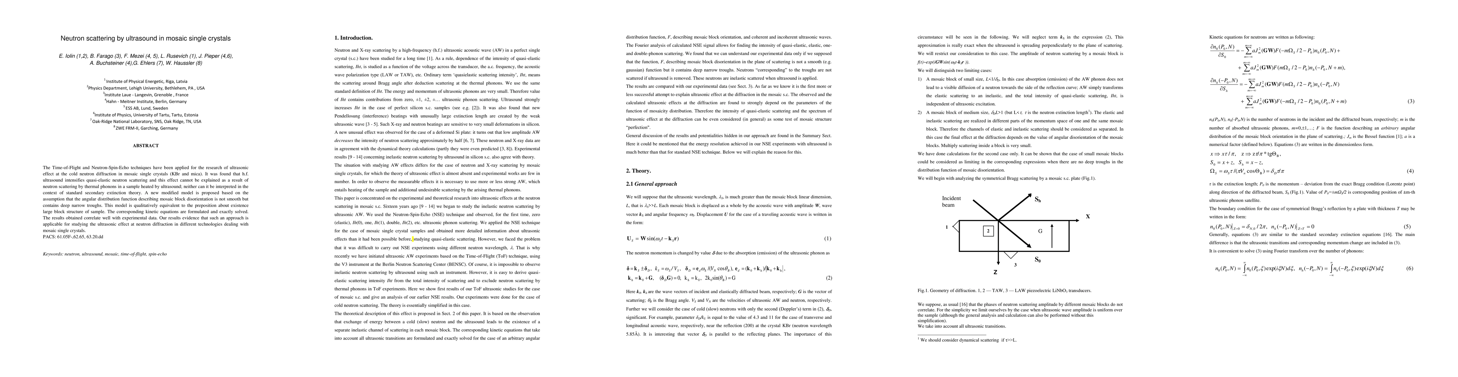 The Time-of-Flight and Neutron-Spin-Echo techniques have been applied for the research of ultrasonic effect at the cold neutron diffraction in mosaic single crystals (KBr and mica). It was found that h.f. ultrasound intensifies quasi-elastic neutron scattering and this effect cannot be explained as a result of neutron scattering by thermal phonons in a sample heated by ultrasound; neither can it be interpreted in the context of standard secondary extinction theory. A new modified model is proposed based on the assumption that the angular distribution function describing mosaic block disorientation is not smooth but contains deep narrow troughs. This model is qualitatively equivalent to the preposition about existence large block structure of sample. The corresponding kinetic equations are formulated and exactly solved. The results obtained correlate well with experimental data. Our results evidence that such an approach is applicable for studying the ultrasonic effect at neutron diffraction in different technologies dealing with mosaic single crystals. PACS: 61.05F-,62.65, 63.20.dd Keywords: neutron, ultrasound, mosaic, time-of-flight, spin-echo