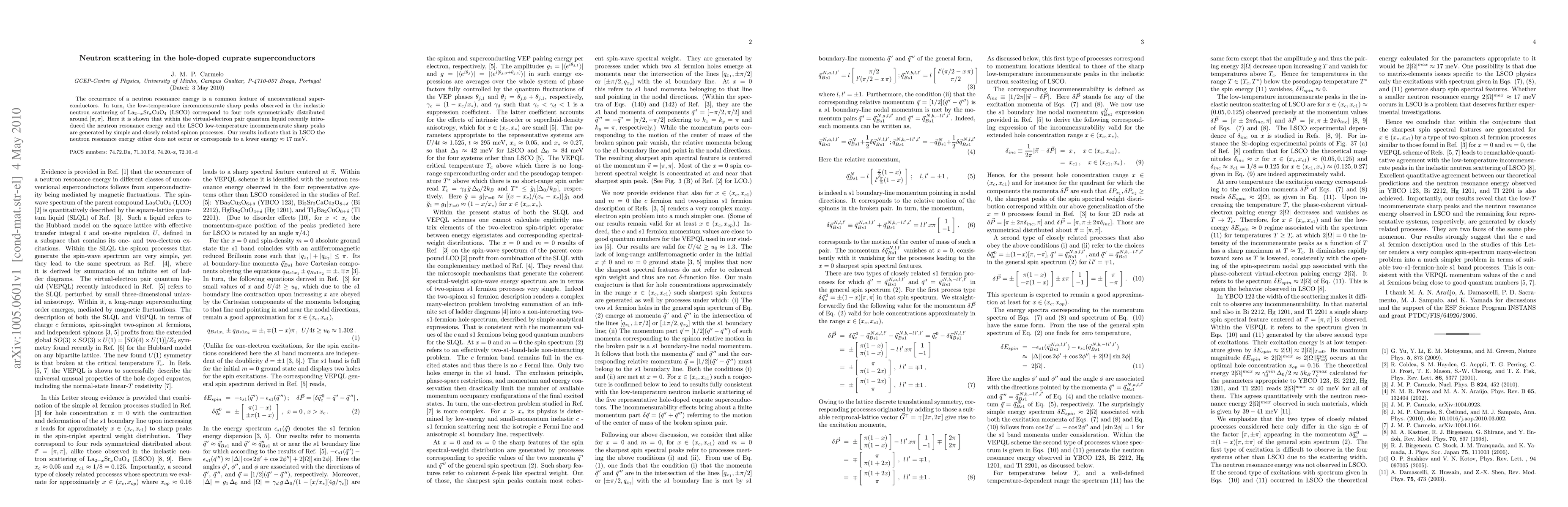 This paper investigates the neutron scattering phenomena in hole-doped cuprate superconductors, specifically La$_{2-x}$Sr$_x$CuO$_4$ (LSCO), revealing that low-temperature incommensurate sharp peaks are due to spinon processes within the virtual-electron pair quantum liquid framework. The study concludes that the neutron resonance energy in LSCO is either absent or occurs at a lower energy of approximately 17 meV.