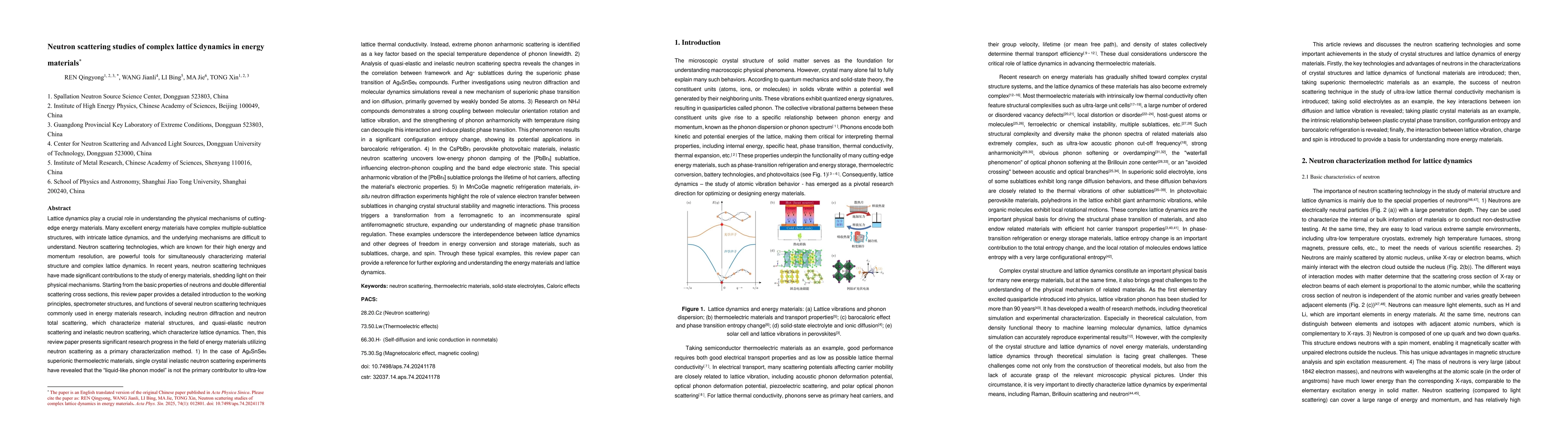 The paper provides a comprehensive review of neutron scattering techniques applied to energy materials, highlighting their utility in understanding complex lattice dynamics.