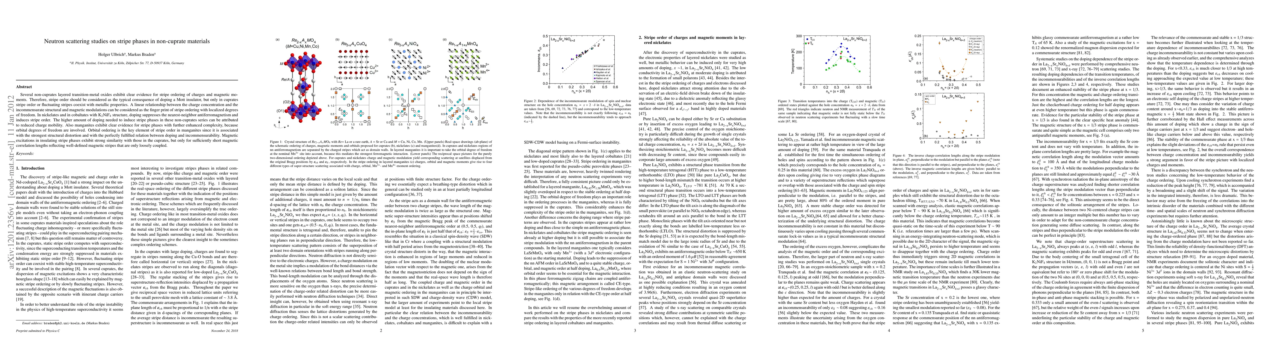 Neutron scattering studies reveal that non-cuprate layered transition-metal oxides, such as nickelates, cobaltates, and manganites, exhibit stripe ordering in charge and magnetic domains upon doping. The complexity of stripe phases in manganites is heightened by the involvement of orbital ordering, which correlates strongly with structural distortions.