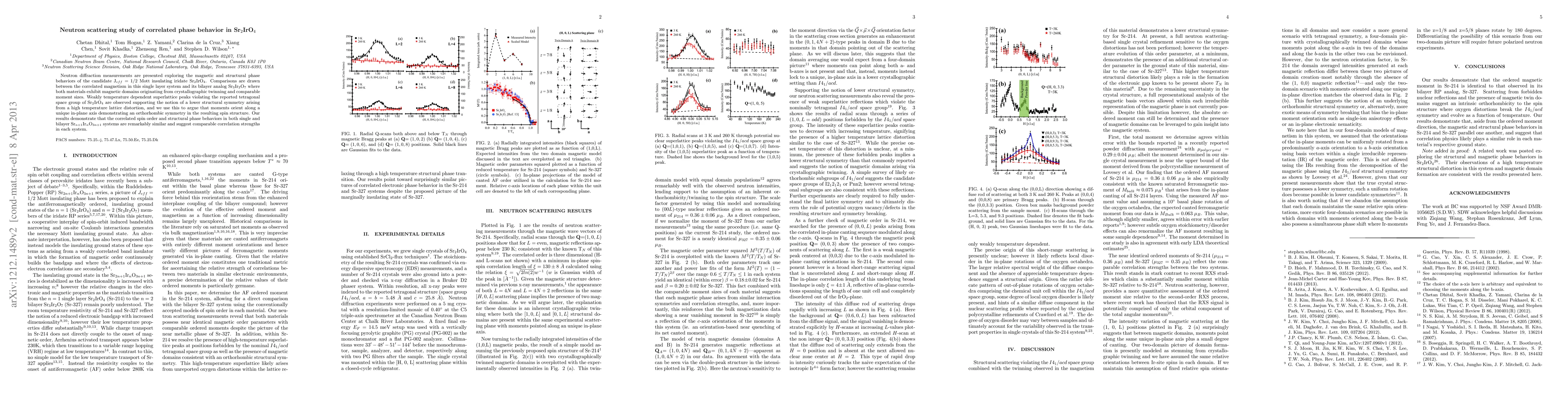 Neutron diffraction measurements are presented exploring the magnetic and structural phase behaviors of the candidate J$_{eff}=1/2$ Mott insulating iridate Sr$_2$IrO$_4$. Comparisons are drawn between the correlated magnetism in this single layer system and its bilayer analog Sr$_3$Ir$_2$O$_7$ where both materials exhibit magnetic domains originating from crystallographic twinning and comparable moment sizes. Weakly temperature dependent superlattice peaks violating the reported tetragonal space group of Sr$_2$IrO$_4$ are observed supporting the notion of a lower structural symmetry arising from a high temperature lattice distortion, and we use this to argue that moments orient along a unique in-plane axis demonstrating an orthorhombic symmetry in the resulting spin structure. Our results demonstrate that the correlated spin order and structural phase behaviors in both single and bilayer Sr$_{n+1}$Ir$_{n}$O$_{3n+1}$ systems are remarkably similar and suggest comparable correlation strengths in each system.