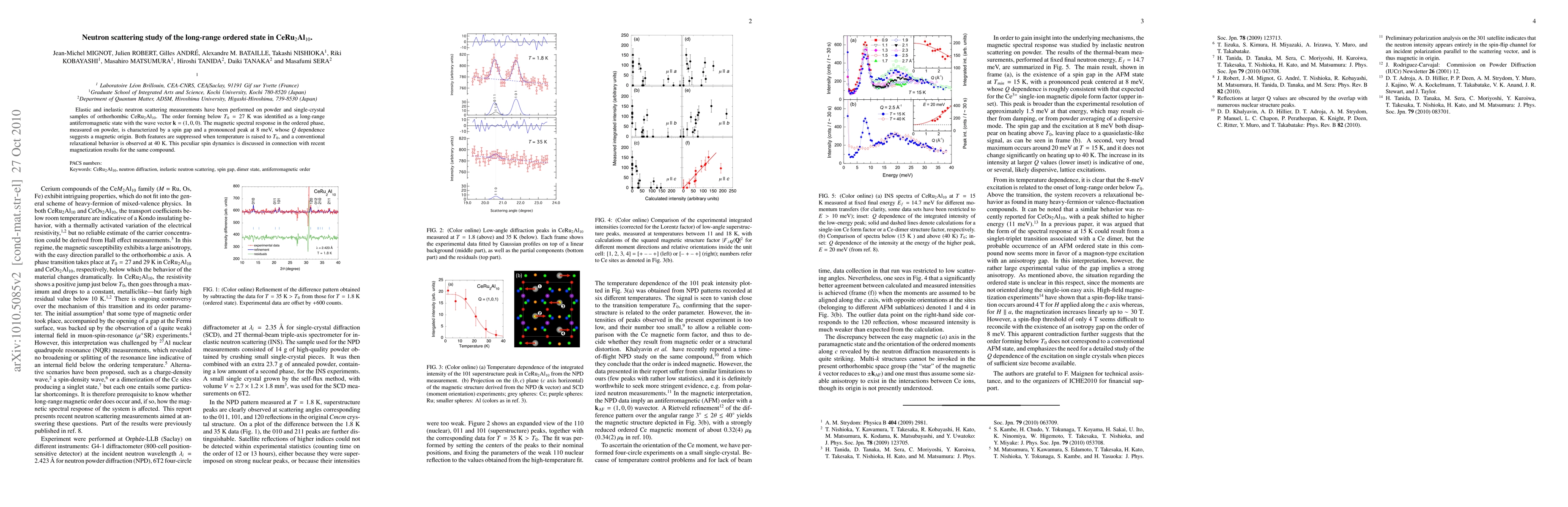 Elastic and inelastic neutron scattering measurements have been performed on powder and single-crystal samples of orthorhombic CeRu2Al10. The order forming below T0 = 27 K was identified as a long-range antiferromagnetic state with the wave vector k = (1,0,0). The magnetic spectral response in the ordered phase, measured on powder, is characterized by a spin gap and a pronounced peak at 8 meV, whose Q dependence suggests a magnetic origin. Both features are suppressed when temperature is raised to T0, and a conventional relaxational behavior is observed at 40 K. This peculiar spin dynamics is discussed in connection with recent magnetization results for the same compound.