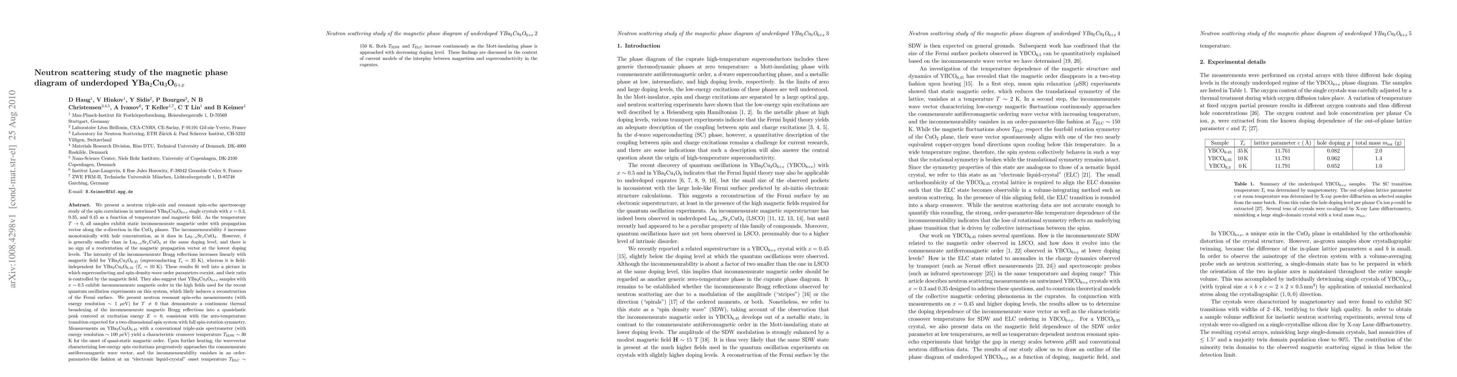 We present a neutron triple-axis and resonant spin-echo spectroscopy study of the spin correlations in untwinned YBCO crystals with x= 0.3, 0.35, and 0.45 as a function of temperature and magnetic field. As the temperature T approaches 0, all samples exhibit static incommensurate magnetic order with propagation vector along the a-direction in the CuO2 planes. The incommensurability delta increases monotonically with hole concentration, as it does in LSCO. However, delta is generally smaller than in LSCO at the same doping level. The intensity of the incommensurate Bragg reflections increases with magnetic field for YBCO(6.45) (superconducting Tc = 35 K), whereas it is field-independent for YBCO(6.35) (Tc = 10 K). These results suggest that YBCO samples with x ~ 0.5 exhibit incommensurate magnetic order in the high fields used for the recent quantum oscillation experiments on this system, which likely induces a reconstruction of the Fermi surface. We present neutron spin-echo measurements (with energy resolution ~ 1 micro-eV) for T > 0 that demonstrate a continuous thermal broadening of the incommensurate magnetic Bragg reflections into a quasielastic peak centered at excitation energy E = 0, consistent with the zero-temperature transition expected for a two-dimensional spin system with full spin-rotation symmetry. Measurements on YBCO(6.45) with a triple-axis spectrometer (with energy resolution ~ 100 micro-eV) yield a crossover temperature T_SDW ~ 30 K for the onset of quasi-static magnetic order. Upon further heating, the wavevector characterizing low-energy spin excitations approaches the commensurate antiferromagnetic wave vector, and the incommensurability vanishes in an order-parameter-like fashion at an "electronic liquid-crystal" onset temperature T_ELC ~ 150 K. Both T_SDW and T_ELC increase continuously as the Mott-insulating phase is approached with decreasing doping level.