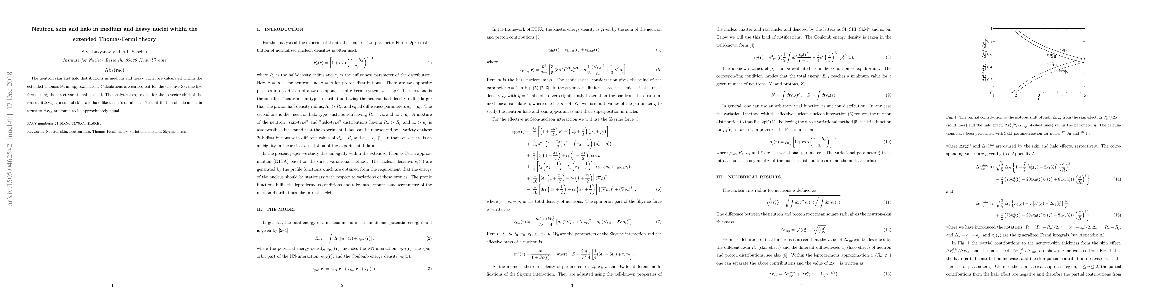 The neutron skin and halo distributions in medium and heavy nuclei are calculated within the extended Thomas-Fermi approximation. Calculations are carried out for the effective Skyrme-like forces using the direct variational method. The analytical expression for the isovector shift of the rms radii $\Delta r_{np}$ as a sum of skin- and halo-like terms is obtained. The contribution of halo and skin terms to $\Delta r_{np}$ are found to be approximately equal.