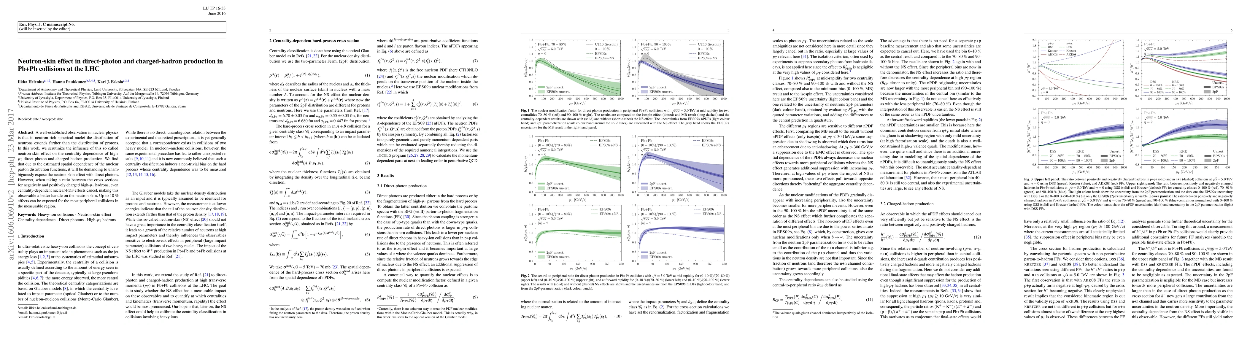A well-established observation in nuclear physics is that in neutron-rich spherical nuclei the distribution of neutrons extends farther than the distribution of protons. In this work, we scrutinize the influence of this so called neutron-skin effect on the centrality dependence of high-$p_{\rm T}$ direct-photon and charged-hadron production. We find that due to the estimated spatial dependence of the nuclear parton distribution functions, it will be demanding to unambiguously expose the neutron-skin effect with direct photons. However, when taking a ratio between the cross sections for negatively and positively charged high-$p_{\rm T}$ hadrons, even centrality-dependent nuclear-PDF effects cancel, making this observable a better handle on the neutron skin. Up to 20~\% effects can be expected for the most peripheral collisions.