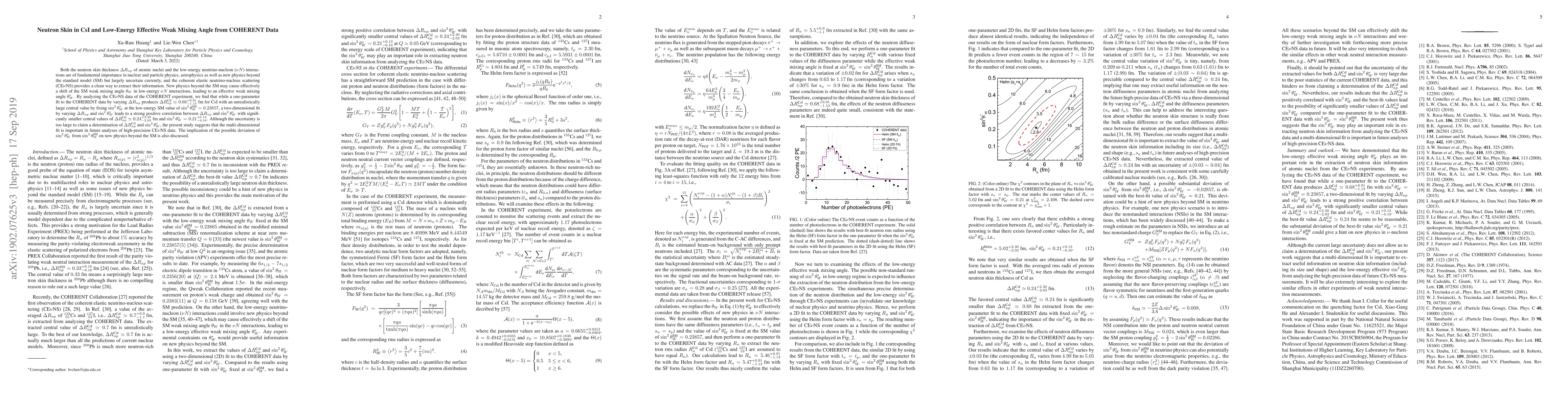 Researchers analyzed COHERENT experiment data to study neutron skin thickness in CsI and low-energy effective weak mixing angle, finding a strong positive correlation between the two with smaller central values, suggesting future high-precision CE\nu NS data analysis is crucial.